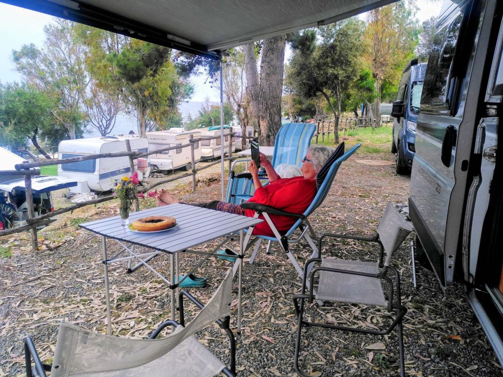 Auf unserem Campingplatz muss man zum Internet laufen, manchmal funktioniert es am Strand, manchmal oben an der Rezeption. Am Nachmittag gehe ich also zum Internet, Wordeln und Italienisch lernen, damit die streaks nicht abreißen. Außerdem ist der Blick hier schön.