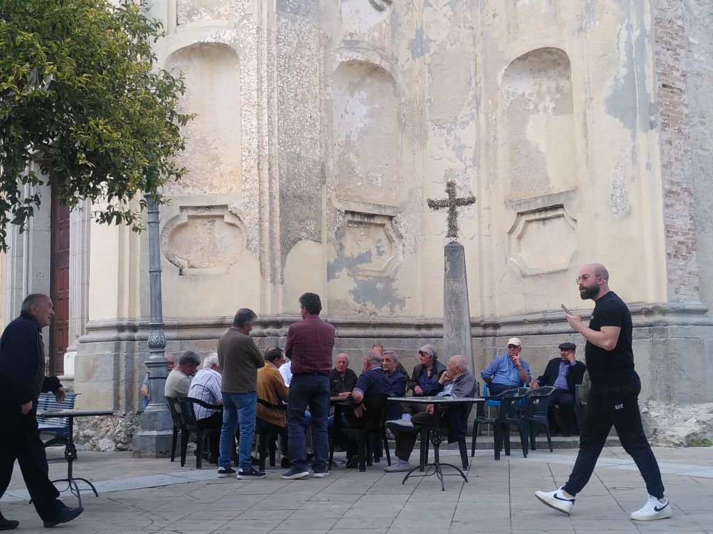 Auf dem Hinweg sind wir über die steil ansteigende Straße gelaufen, zurück finden wir einen abschüssigen Treppenweg durchs Dorf. Auf der belebten und vom männlichen Teil des Dorfes besuchten Piazza gibt es dann auch für uns noch ein Plätzchen.