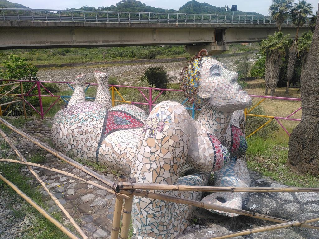 Die drei bunt bemalten Bronze-Skulpturen, die seit 2007 an der Uferpromenade in Reggio Calabria stehen, sind ein Werk der römischen Bildhauerin Paola Epifani (*1969), die unter dem Pseudonym Rabarama firmiert.
