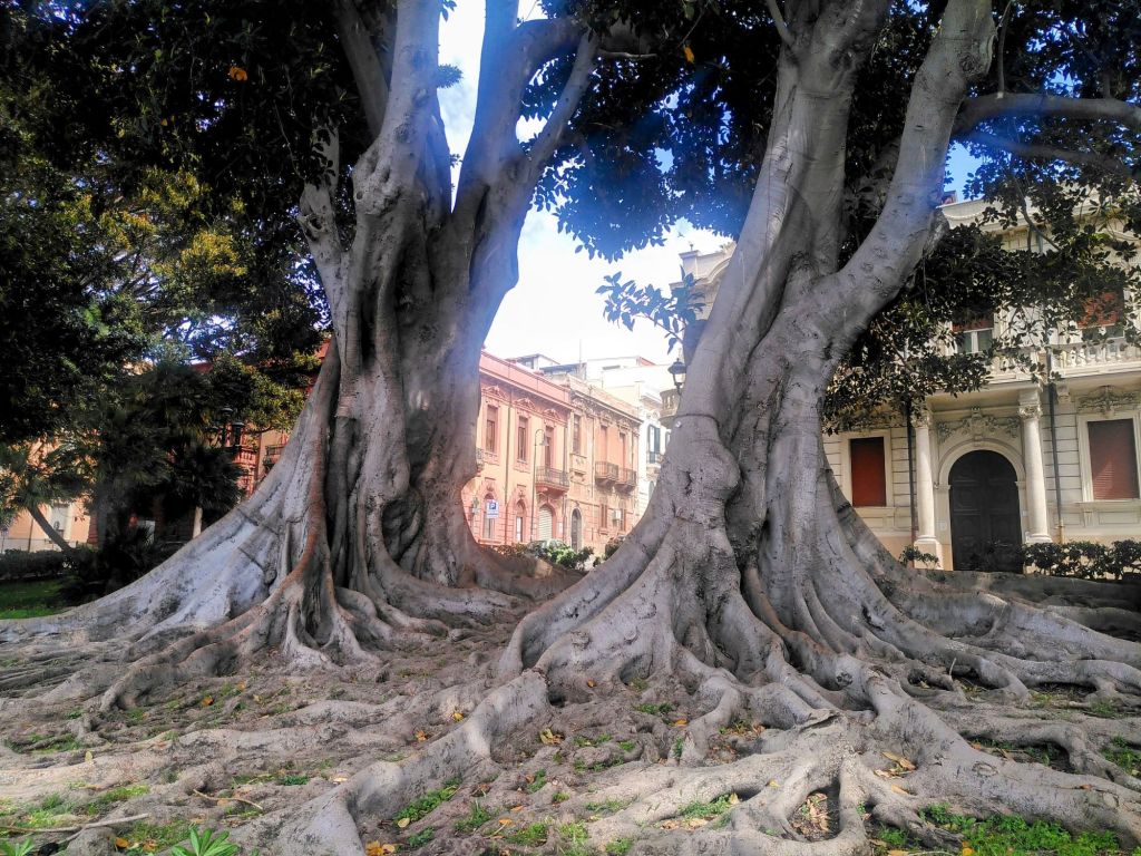 Die Uferpromenade von Reggio Calabria ist selbst eine Überraschung für mich. Auf der einen Seite wird sie von hervorragend erhaltenen Palästen gesäumt, auf der anderen Seite natürlich vom Meer, Blick auf Sizilien und den Ätna inbegriffen. Entlang der breiten Promenade zeigt uns die Natur, dass sie die Älteste aller Künste ist: ein Großblättriger Feigenbaum, riesiger Stamm, mit ausladender Krone und verschlungenen Wurzeln. Ein Feigenbaum? Mindestens 20 Giganten zeigen hier ihre Pracht.