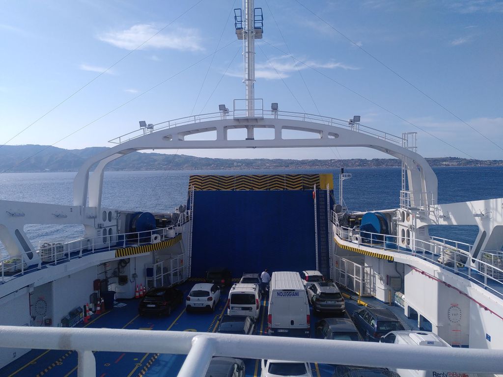 Schließlich machen wir uns auf zum Hafen, kaufen Tickets nach Messina und können schon bald auf eine der Fähren, die hier häufig verkehren.