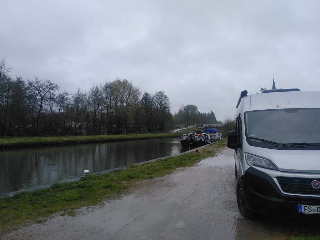 Auf eine weitere Besichtigung verzichten wir. Zu nass, zu kalt. Also bleibt Gien doch auf dem Zettel. Wir fahren weiter. Aber noch nicht direkt nach Reims sondern zur Kaffeepause nach Montbouy, wo wir vor 53 Tagen bereits auf der Hinfahrt so idyllisch am Kanal genächtigt haben.