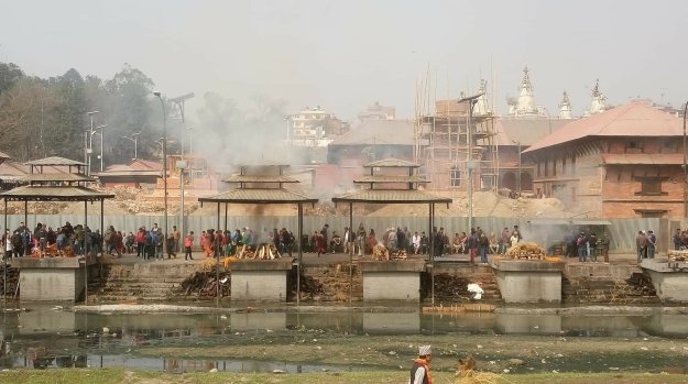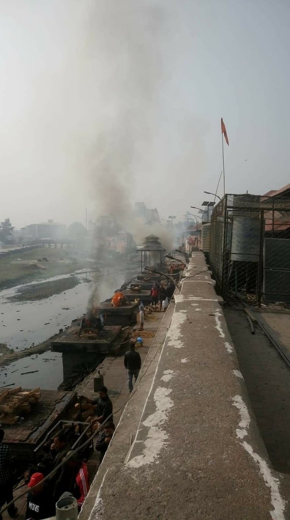 Dass ich zum Abschied zu DER Abschiedsstätte in Nepal schlechthin fahre, hat durchaus eine (von mir gar nicht beabsichtigte) Symbolik. Pashupatinah ist die größte Verbrennungsstätte Nepals. Ein geheimnisvoller, fremder Ort. Ich bin früh um kurz nach neun dort. Auf den Gatts, den Plattformen für die Leichenverbrennung, lodern bereits etliche Feuer.