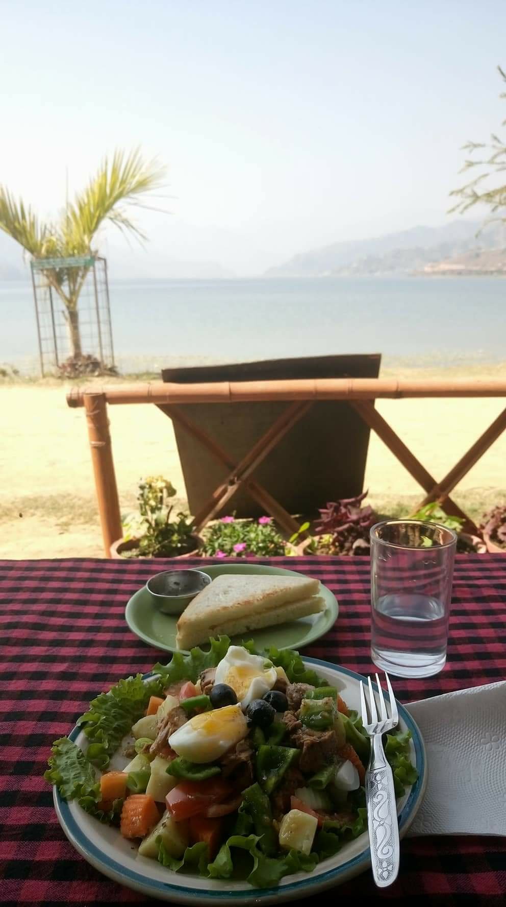 Ich laufe den See entlang und erreiche nach 20 Minuten ein Restaurant, in dem ich auf einer hübschen Dachterrasse erstmal frühstücke.