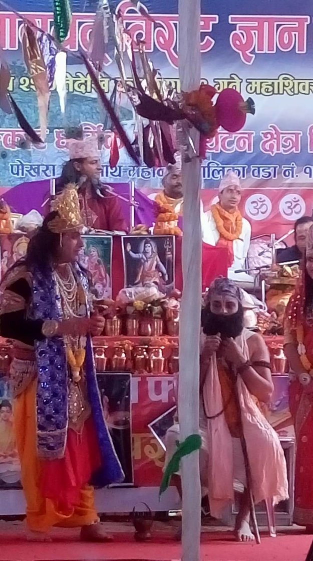 Gegen vier Uhr mache ich mich auf zum Tempel. Seit ich hier bin, höre ich von dort Stimmen und Musik. Meine Wirtin hat sich auch mit der Bemerkung verabschiedet, dass sie jetzt dorthin geht. Ich kann nicht wirklich einordnen, was ich sehe. Eine bunte Bühne, auf der mehrere Schauspieler agieren. Die Sprecher sitzen hinter ihnen. Ich glaube, dass hier die Geschichte einer der zahlreichen hinduistischen Gottheiten erzählt wird. Morgen ist Shivas Geburtstag und ein wichtiger Feiertag.