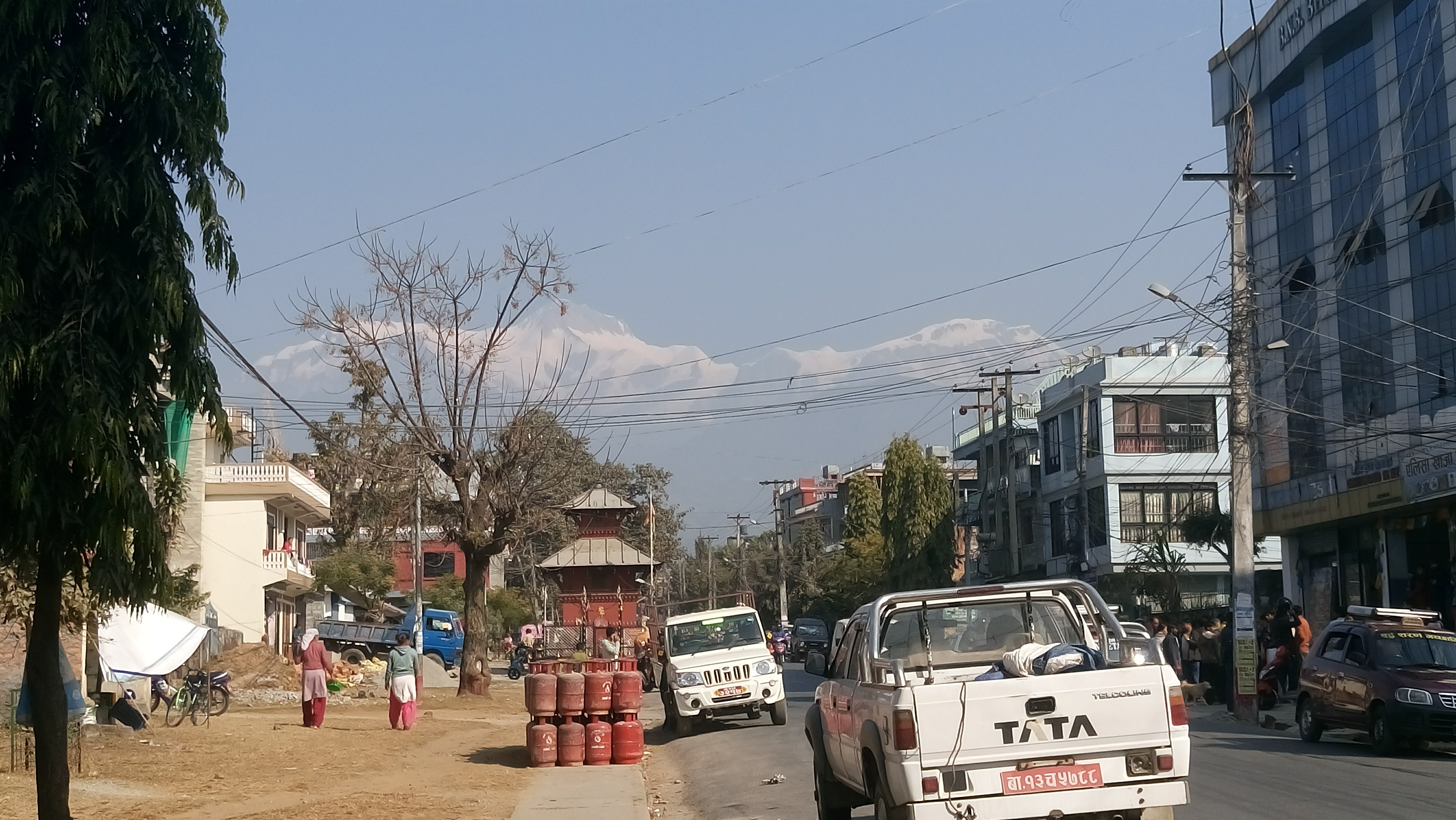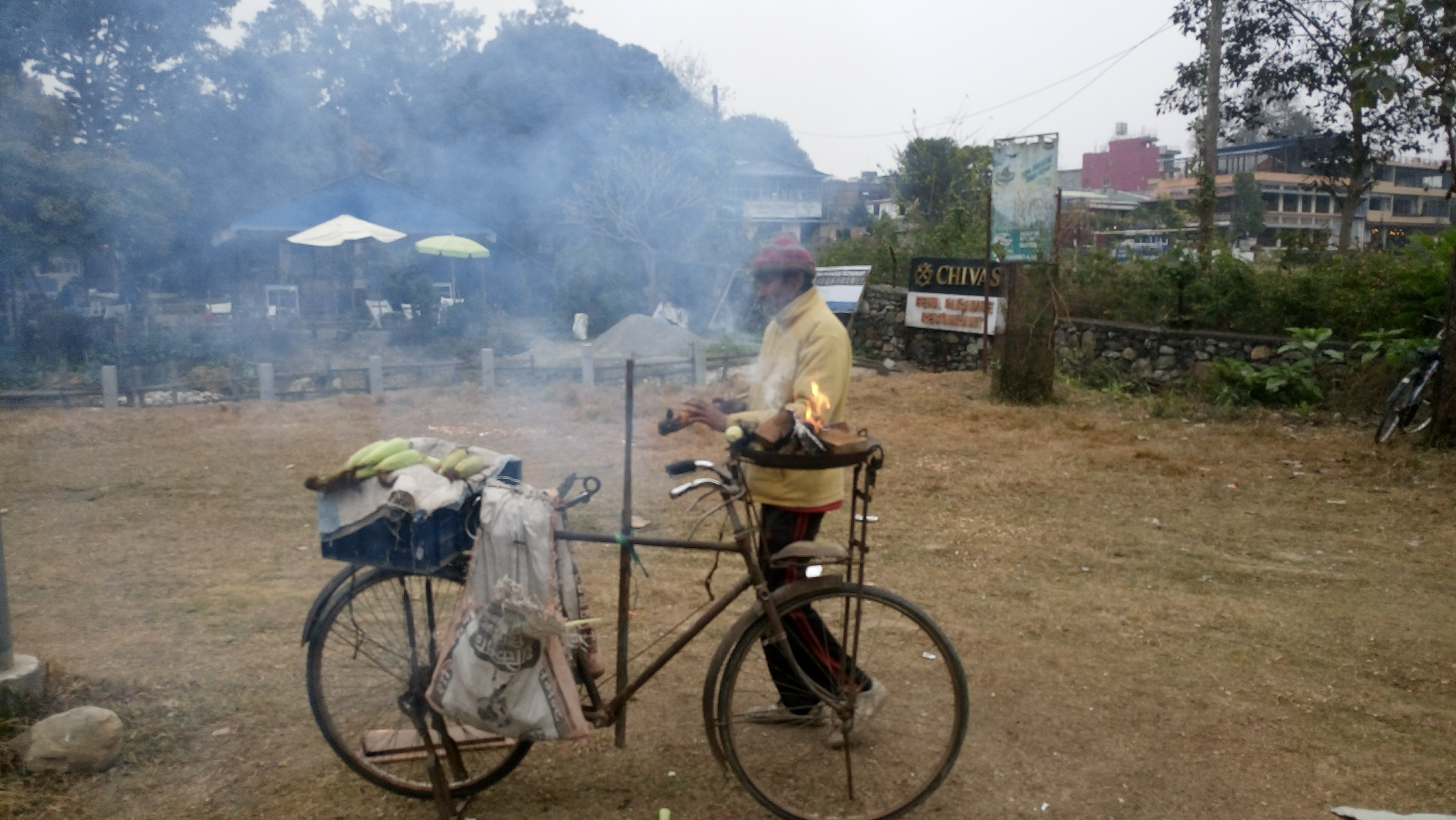 Für die einstündige Fahrt an den rund 15 Kilometer entfernten Begnassee zahlte ich 50 Rupien, also etwa 40 Cent (liest jemand vom MVV hier mit??). Unzählige Male rief der Beifahrer unser Ziel den Fußgängern am Straßenrand zu : „Begnas! Begnas!“ Wie so oft in den letzten Tagen ist es diesig und kühl. Etliche Menschen haben deshalb ein kleines Lagerfeuer entfacht, um sich ein wenig aufzuwärmen. Die Palmen und Bananenstauden wirken bei diesen Temperaturen irgendwie deplatziert. Kühe klauben Essbares vom Straßenrand auf. Stehen sie mitten auf der Straße, werden sie vom Fahrer kunstvoll umkurvt. Auf Baustellen längs des Weges zeigt sich ein hier schon oft gesehenes und dennoch ungewohntes Bild : Frauen beladen Tragekörbe mit Ziegelsteinen, platzieren sie so, dass der Tragegurt entlang ihrer Stirn verläuft und schleppen ihre schwere Last über die Baustelle. Es sind einige darunter, die erheblich älter sind als ich.