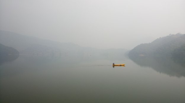Gegen 12 Uhr erreichen wir Begnas. Nach einem kurzen Spaziergang durch eine schmale Geschäftsstraße erreiche ich den See. Zwar kämpft die Sonne mit aller Kraft, sie schafft es aber nicht, den Nebel aufzulösen.