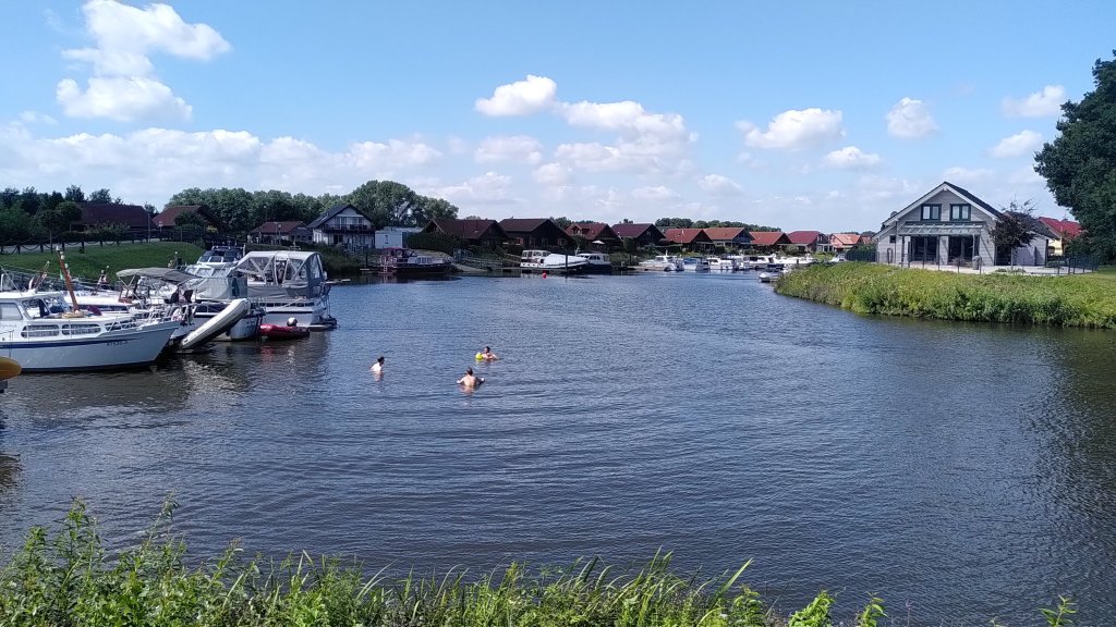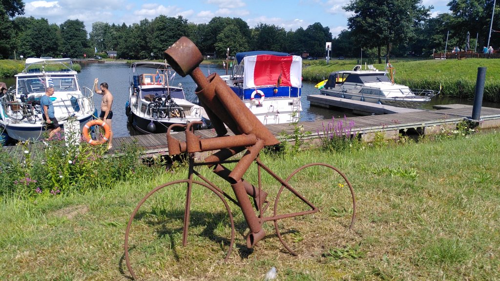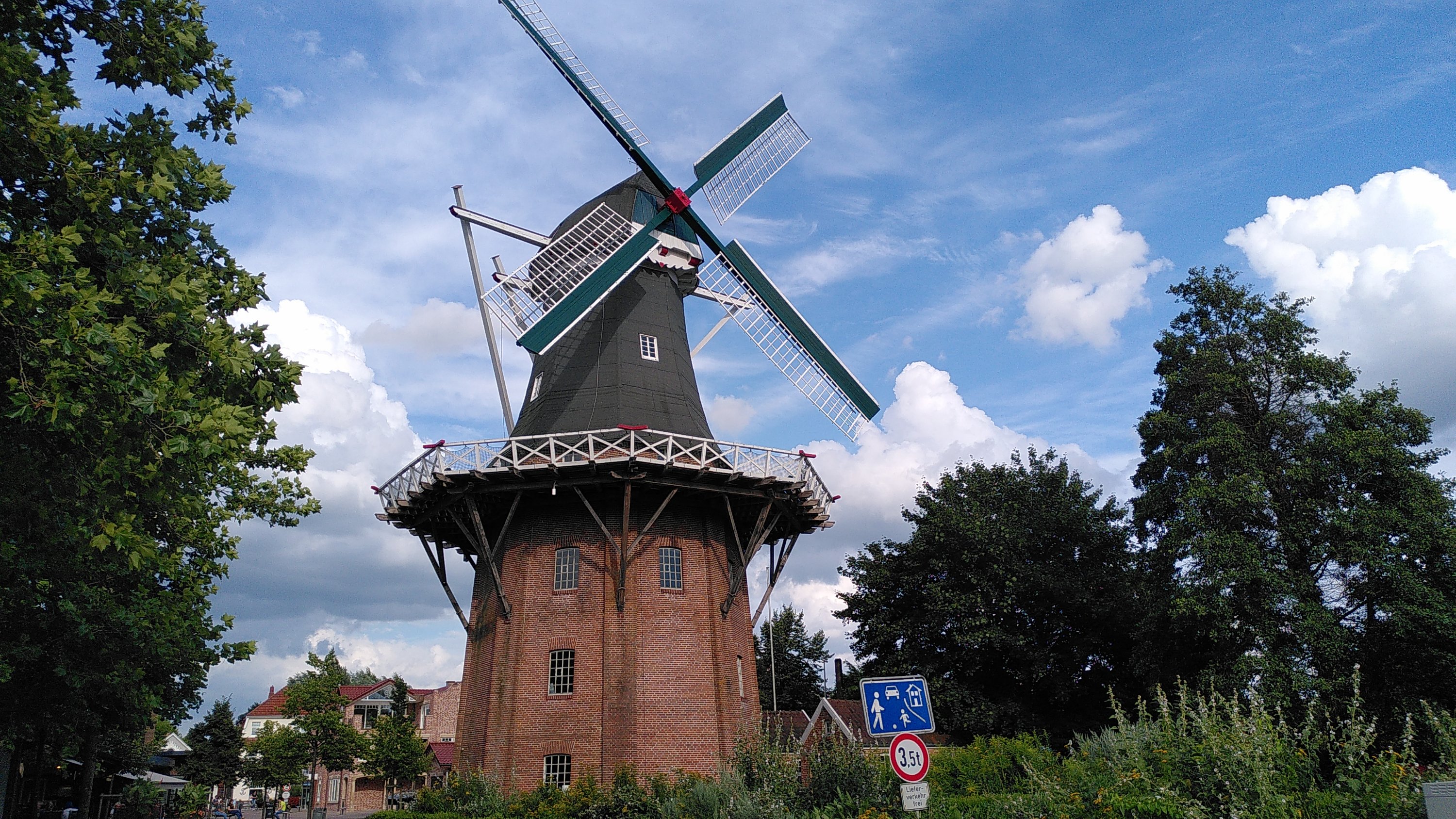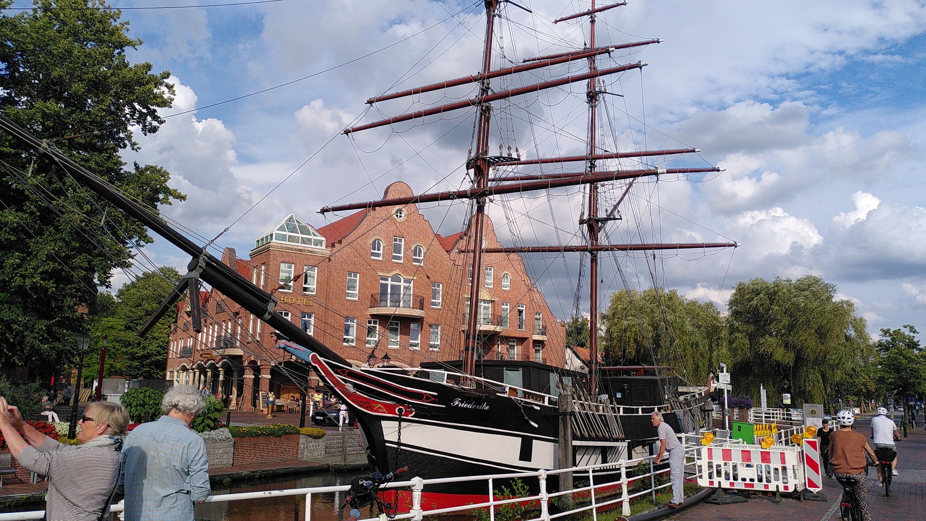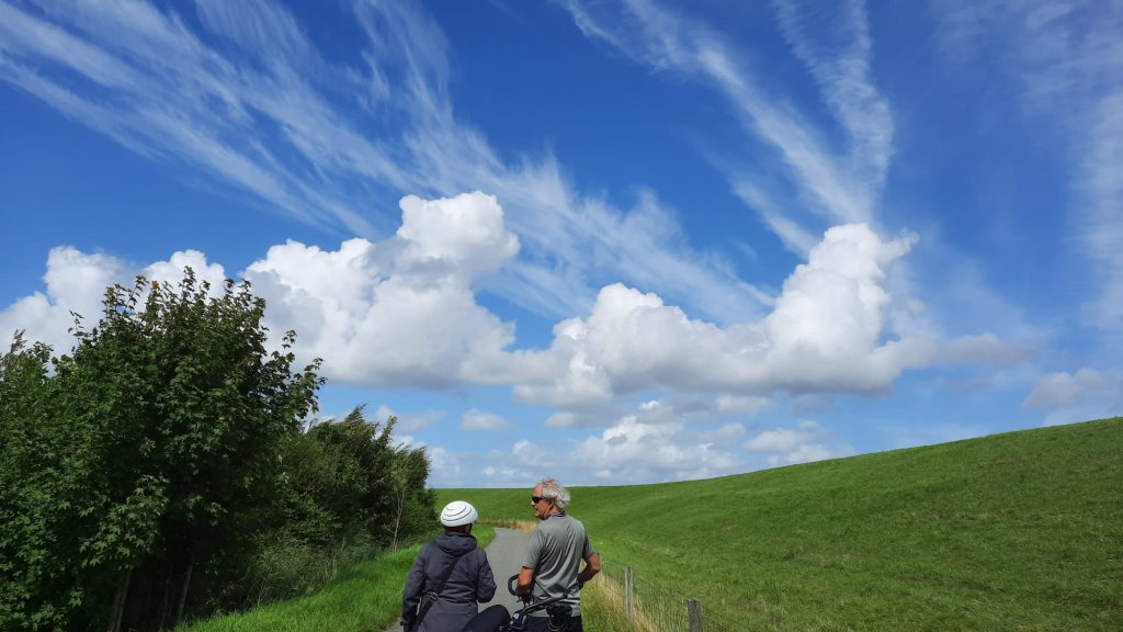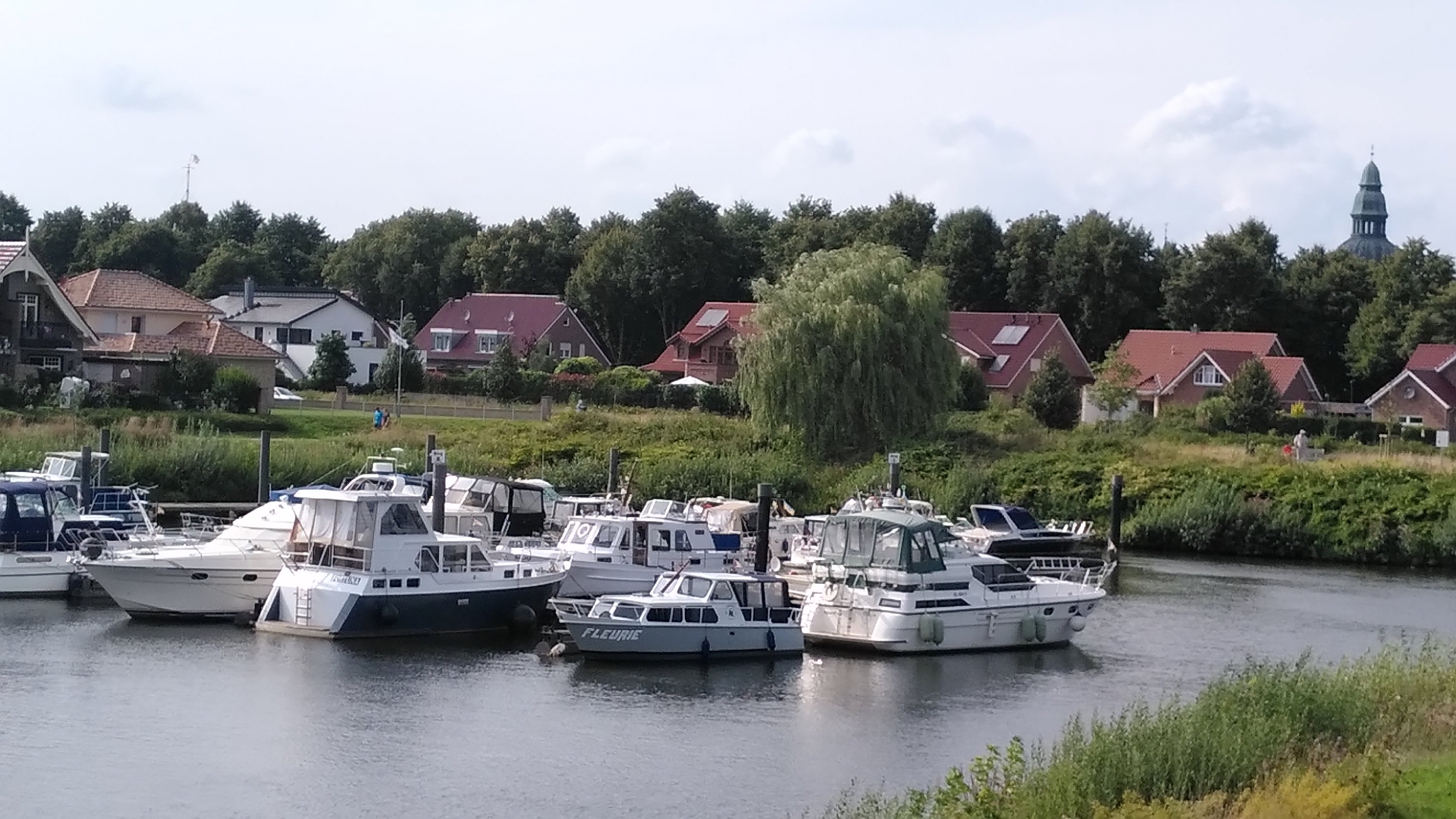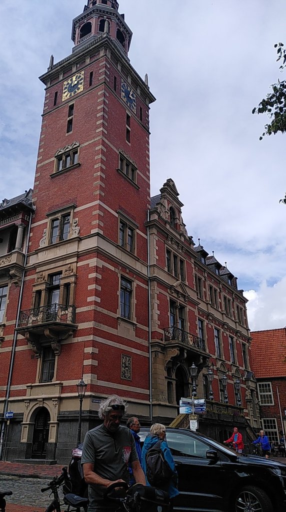 Hier in Ostfriesland, wo wir inzwischen sind, wurde die Ems eingedeicht. Die Nordsee mit ihren Tiden macht sich bemerkbar. So radeln wir heute also hinterm Deich und nützen hin und wieder eine Lücke, um einen Blick auf den Fluss zu erhaschen. Ab und zu gibt es einen kurzen Schauer, aber während unserer Mittagspause in Leer und unserem Stadtbummel dort bleibt es trocken.