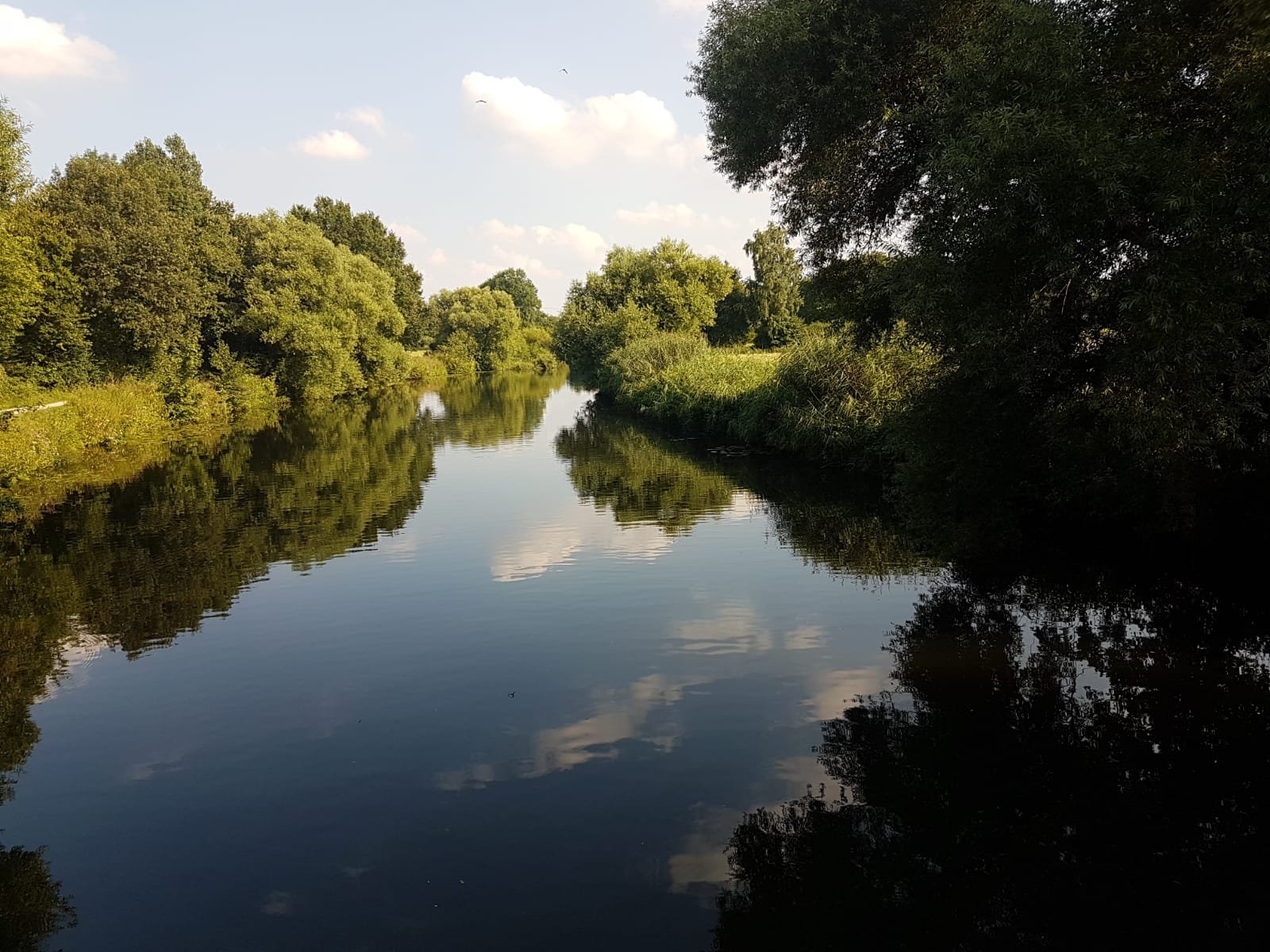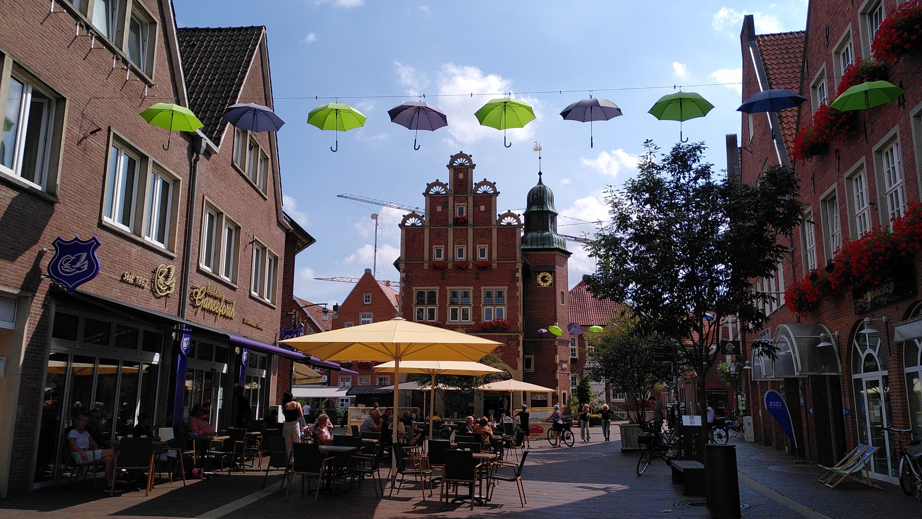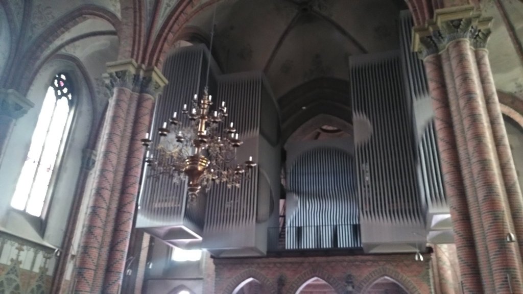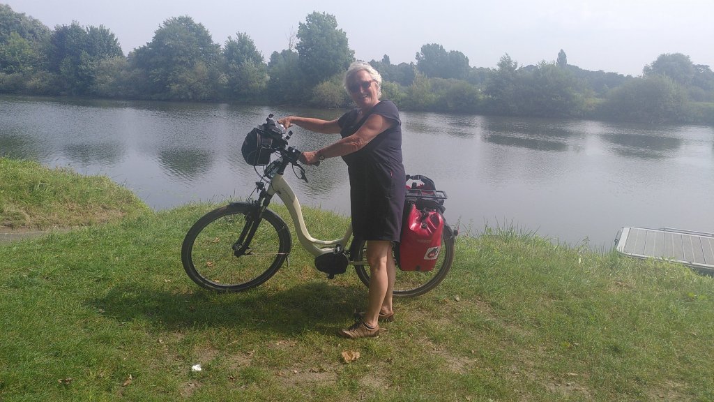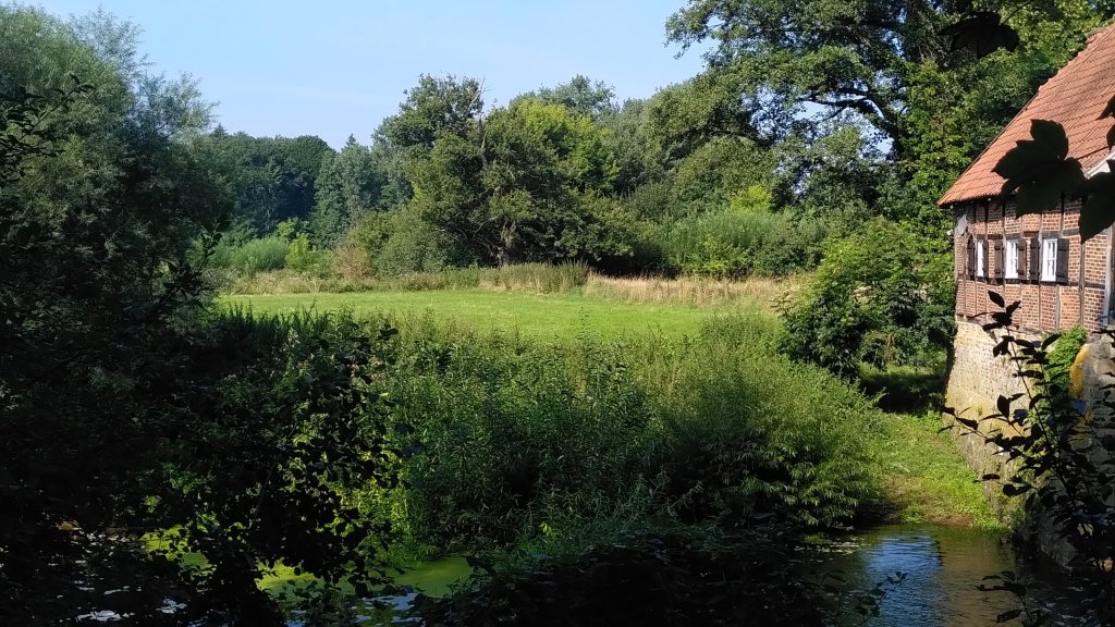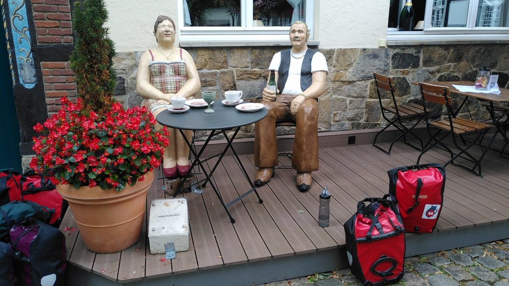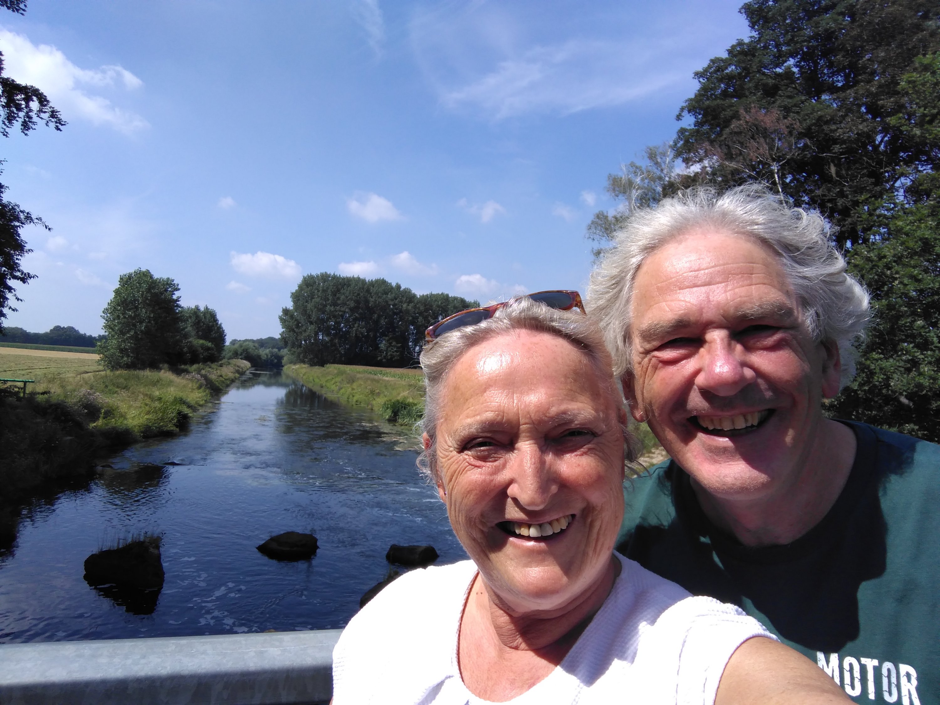 Hier in Ostfriesland, wo wir inzwischen sind, wurde die Ems eingedeicht. Die Nordsee mit ihren Tiden macht sich bemerkbar. So radeln wir heute also hinterm Deich und nützen hin und wieder eine Lücke, um einen Blick auf den Fluss zu erhaschen. Ab und zu gibt es einen kurzen Schauer, aber während unserer Mittagspause in Leer und unserem Stadtbummel dort bleibt es trocken.