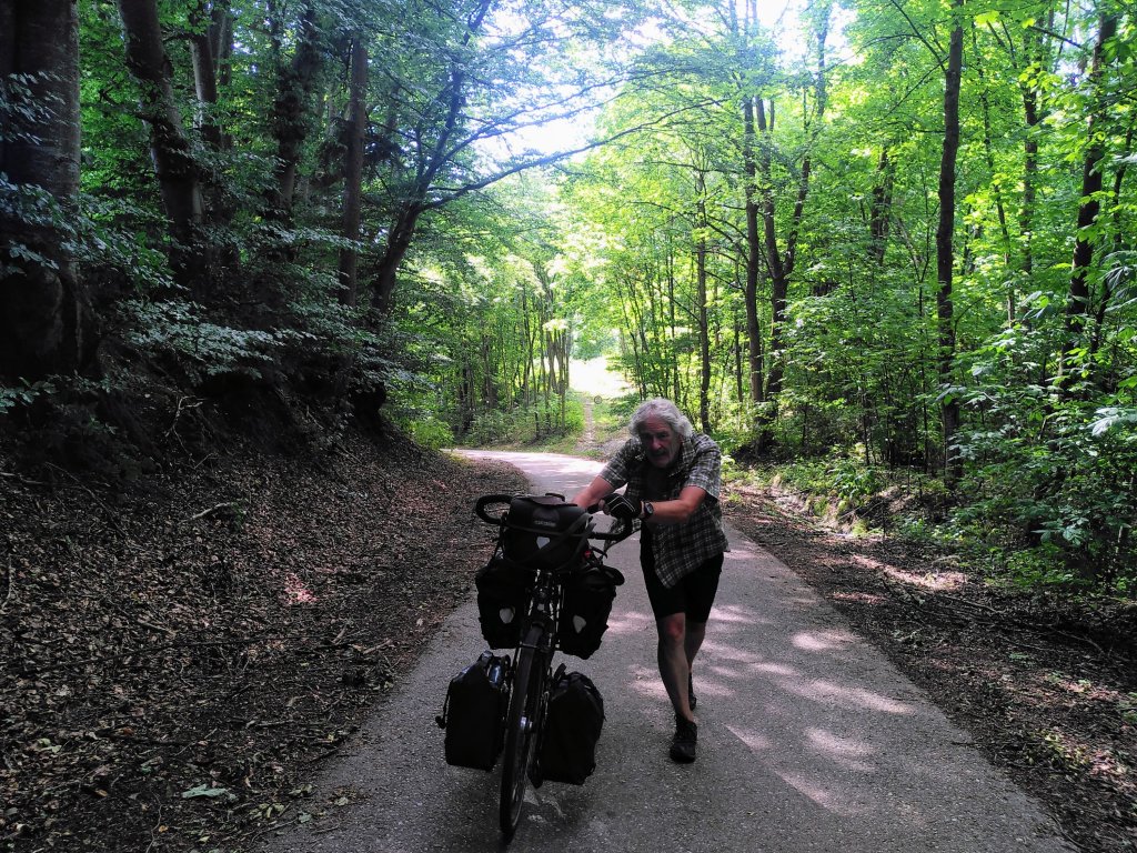 Oft führt der Donauradweg über die Deichkrone, warm, aber mit toller Aussicht. Wenn wir dann vom Fluss weggeleitet werden und in den Wald eintauchen, ist das erfrischend wie ein kühles Bad.
