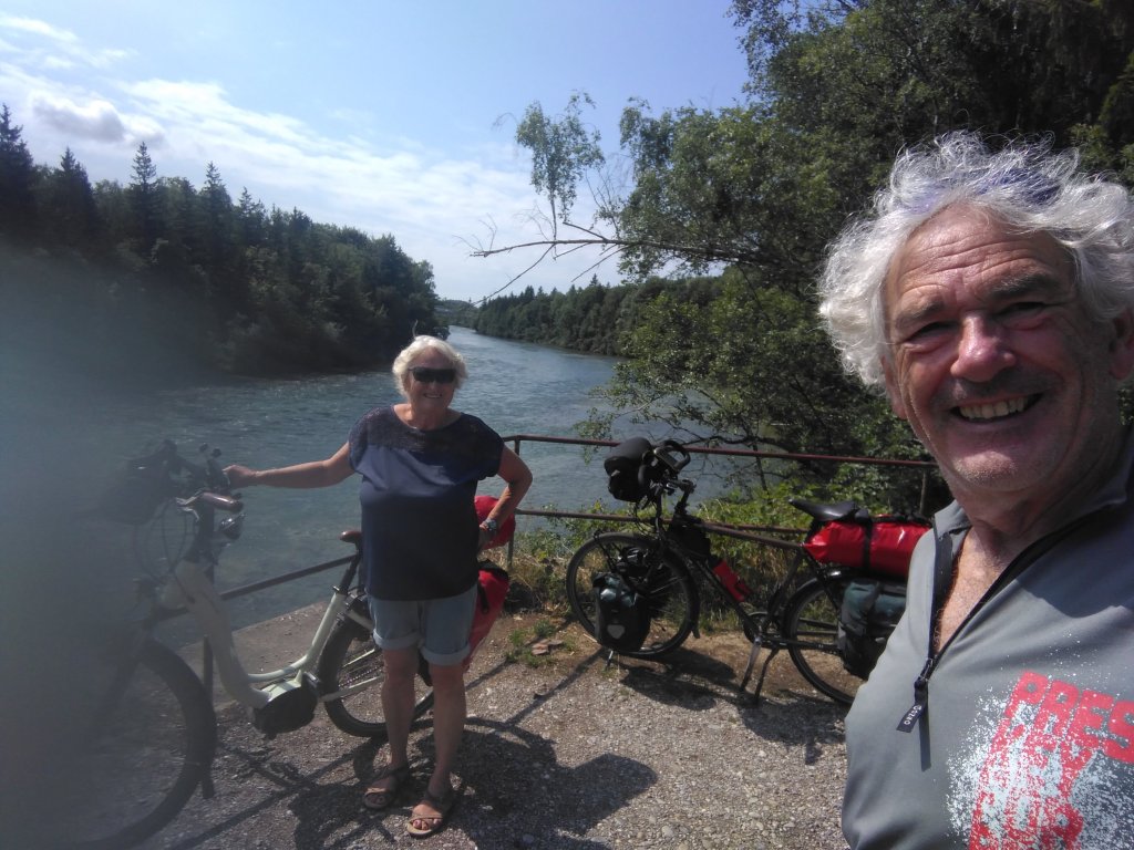 Vom Zeltplatz sind es 14 Kilometer bis zur Mündung des Lech. Auf dem Bild kommt der Lech von links. Wir machen ein Abschiedsbild und heißen unseren dritten Fluss, die Donau, willkommen. An ihr werden wir die kommenden zwei Tage entlang radeln.