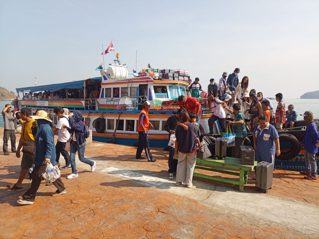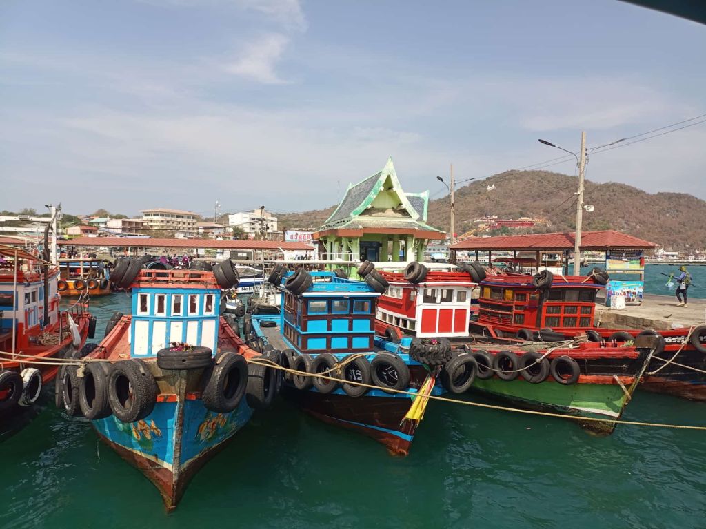 Der Busfahrer übergibt uns nahtlos an einen Tuktuk-Fahrer, der uns an den Pier bringt. Unser Schiff auf die Insel Sichang liegt schon dort. Es fährt aber erst in einer Dreiviertelstunde, so dass wir Zeit genug haben, noch einen Kaffee zu trinken.