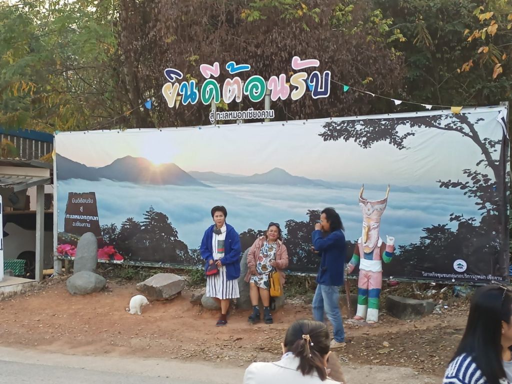 Es war ein Bild wie dieses, vor dem die Damen hier posieren, das wir im Internet gesehen haben und das uns hierher gelockt hat. Der Phu Thok ist berühmt dafür, dass man auf einen Wolkensee über dem Mekong hinunter blicken kann. Heute ist das leider nicht so, der Blick auf den Strom unter uns im Morgendunst ist dennoch sehr schön.