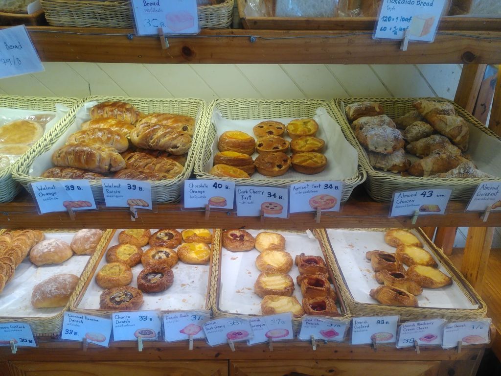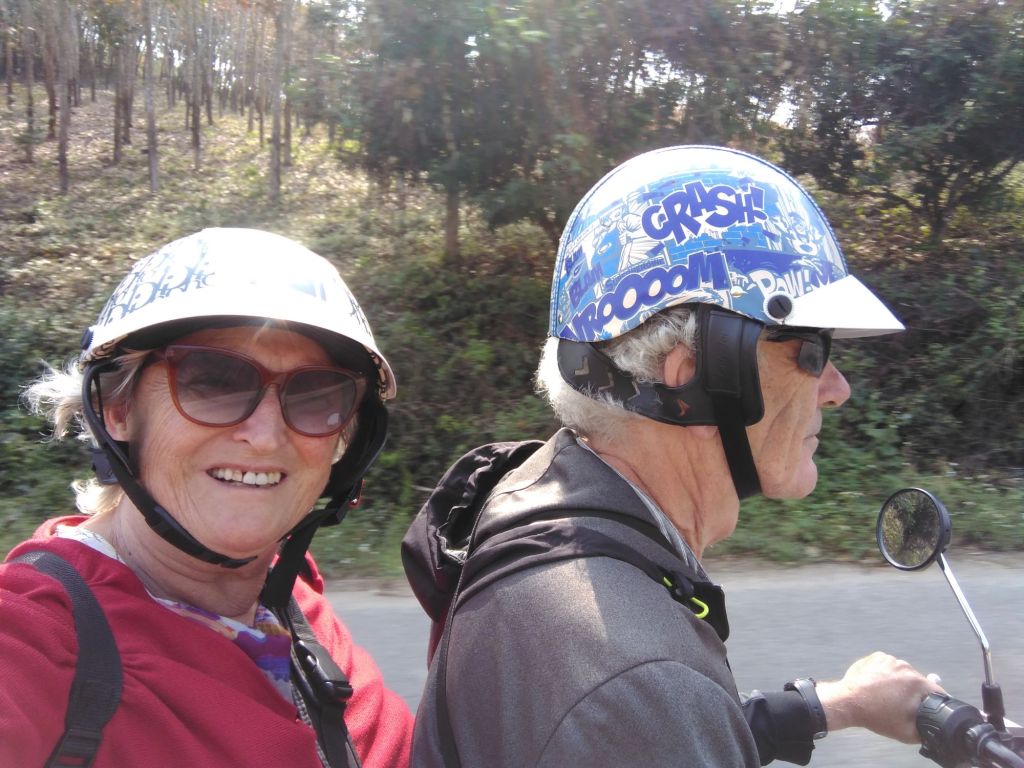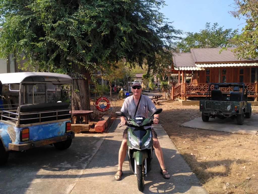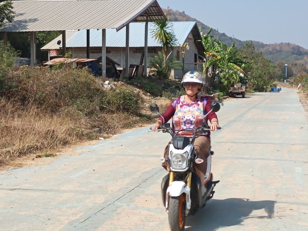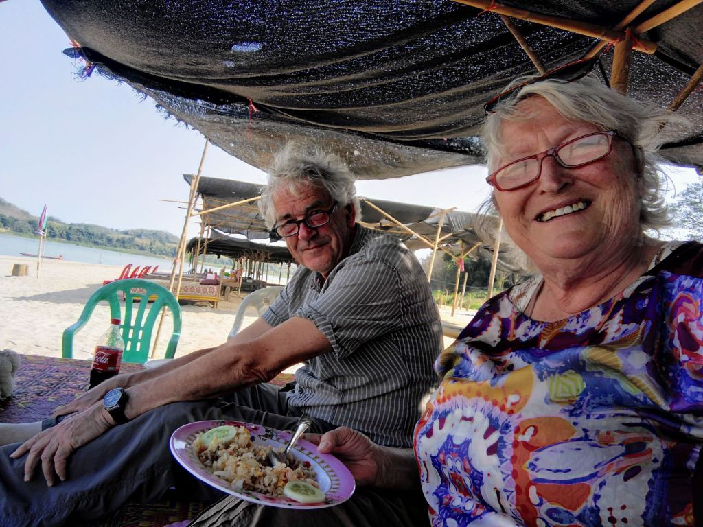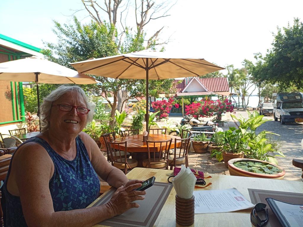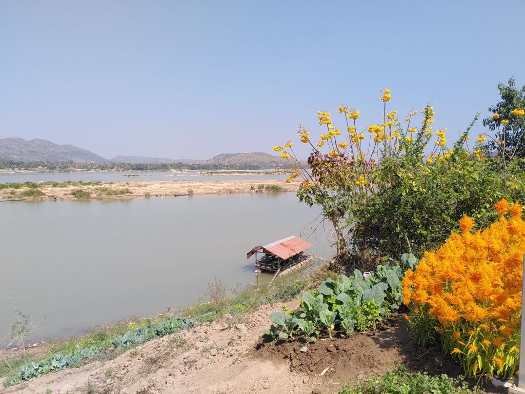 Es ist inzwischen Nachmittag und wir treten die Heimfahrt an. Diese Strecke, wirklich wunderschön entlang des Mekong, ist so untouristisch, dass wir Schwierigkeiten haben, einen Kaffee zu bekommen. Wir wären ja auch mit Instantkaffee zufrieden. Erst kurz vor Chiang Khan finden wir ein Café, in dem es sogar Bananenkuchen gibt.