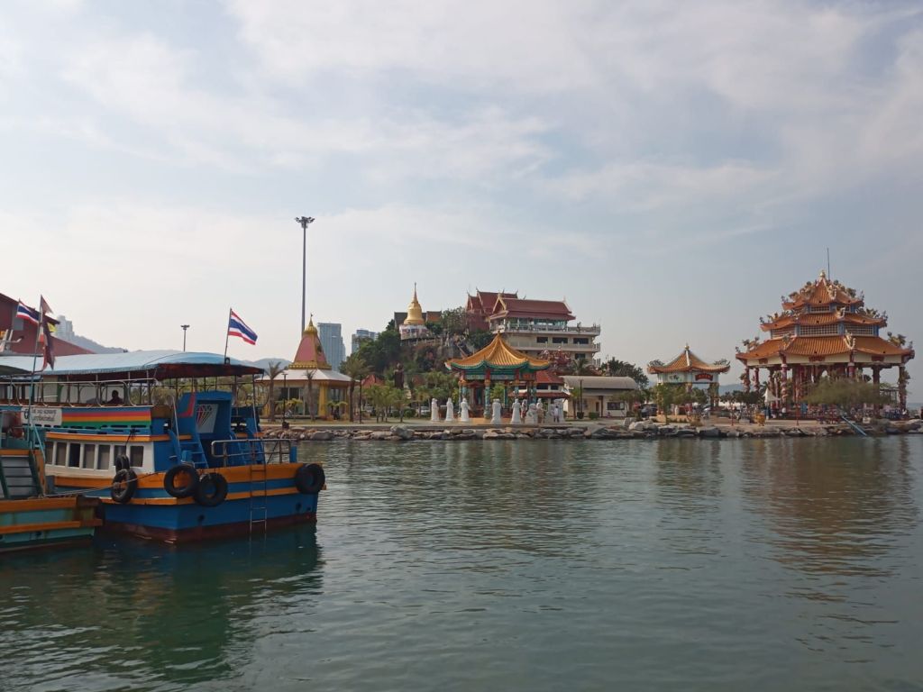 Um zehn geht es an Bord. Der Blick zurück zeigt die Skyline von Siracha.