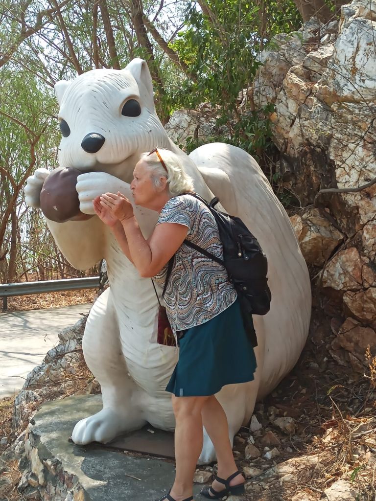 Noch ein Nachtrag zu gestern. Da haben wir, ohne dass wir es wussten, auf unserem Abendspaziergang das Wahrzeichen der Insel gesehen: ein weißes Eichhörnchen. Wie wir heute Morgen durch ein Plakat an einem Geschäft gesehen haben, gibt es diese nur hier! Deshalb gibt es Souvenirs und Plastiken wie diese von dem kleinen Tier. Unseres vom Vorabend war aber ein echtes und hüpfte sehr lebendig von Ast zu Ast.
