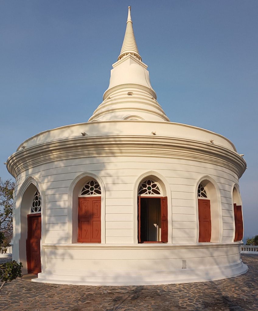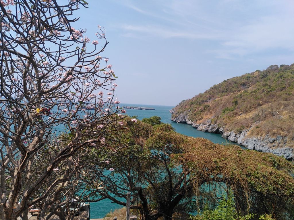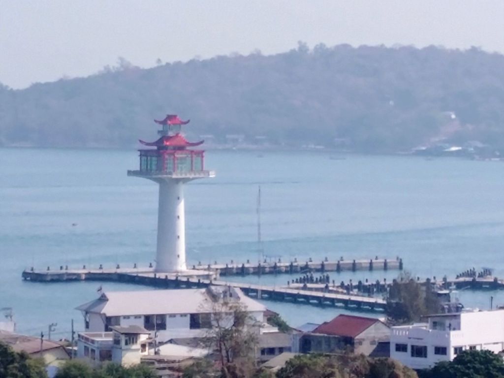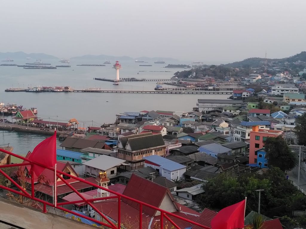Oben angekommen hat man eine prächtige Aussicht aufs Meer und den Pagodengekrönten Leuchtturm von Koh Sichang.