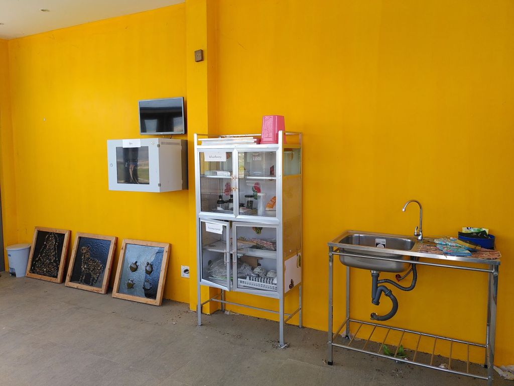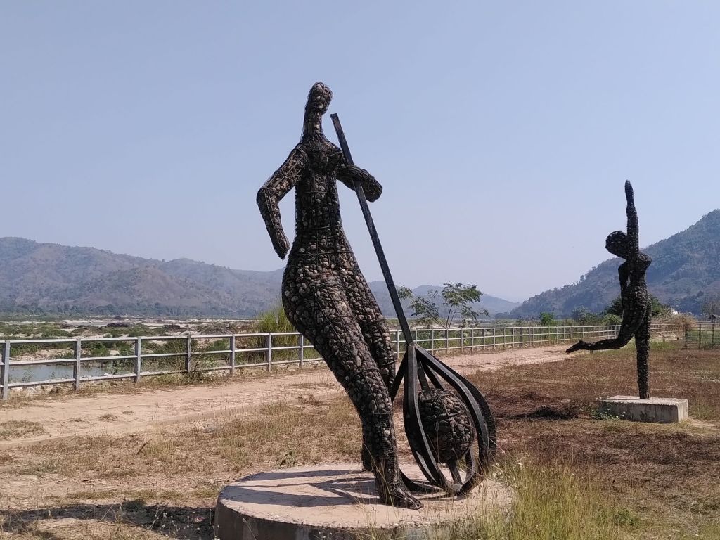Es sind Skulpturen aus Drahtgeflechten, gefüllt mit Mekong-Kieseln. Früher gab es hier auch mal ein Infohäuschen zu dieser kleinen Ausstellung am Fluss, heute ist das ein lost place. Alle Fenster und Türen sind offen, drei Bilder sind an die Wand gelehnt, in einer kleinen Vitrine stehen noch Kaffeetassen und Zuckerstreuer. Eine Spüle gammelt vor sich hin.