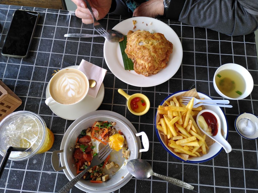 In Pak Chom finden wir ein hübsches Lokal am Fluss und bestellen uns eine lustige Mischung von Speisen: Reis mit Omelette, Spiegelei mit verschiedenen Toppings, Fritten, Passionsfruchtsaft, Kaffee. Den Fischsalat, den ich eigentlich wollte, gab es leider nicht.