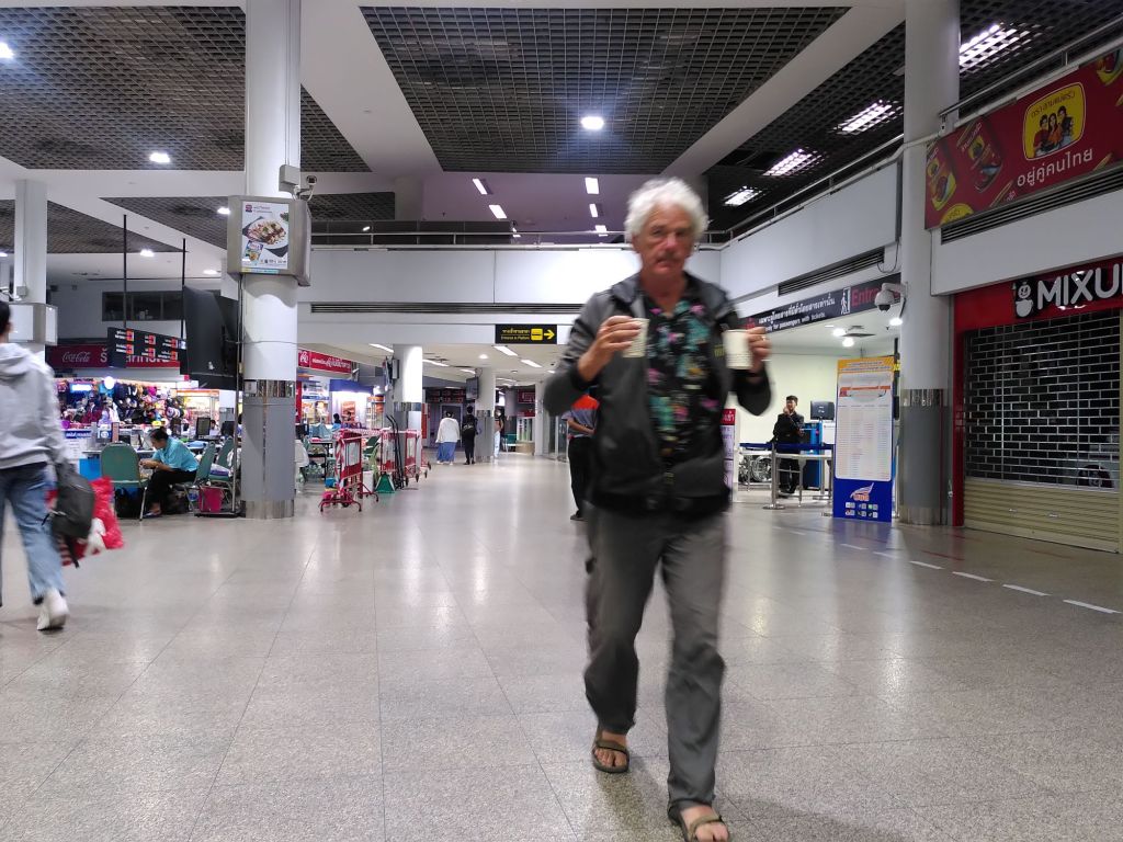 Viel geschlafen habe ich letzte Nacht nicht, obwohl die Fahrt recht komfortabel war. Die Sitze waren bequem und man konnte sie weit zurückstellen, fast darauf liegen. Es gab Wasser, ein süßes, weiches Brötchen und eine Decke. Aber ein Bus ist nunmal kein Zug, der immer schön geradeaus fährt. Ein Bus schaukelt und schlingert, er vibriert, knirscht und knattert. Der Fahrer brettert durch die Berge, legt sich in die Kurven, bis wir in der zweiten Nachthälfte flacheres Terrain erreichen und er den Highway runterdonnern kann. Kopfkino von Busunfällen versuche ich auszuschalten. Ich angele mir Achims Decke und versuche, wieder einzuschlafen. Um halb fünf erreichen wir den Busbahnhof in Bangkok und es gibt erstmal einen Kaffee.