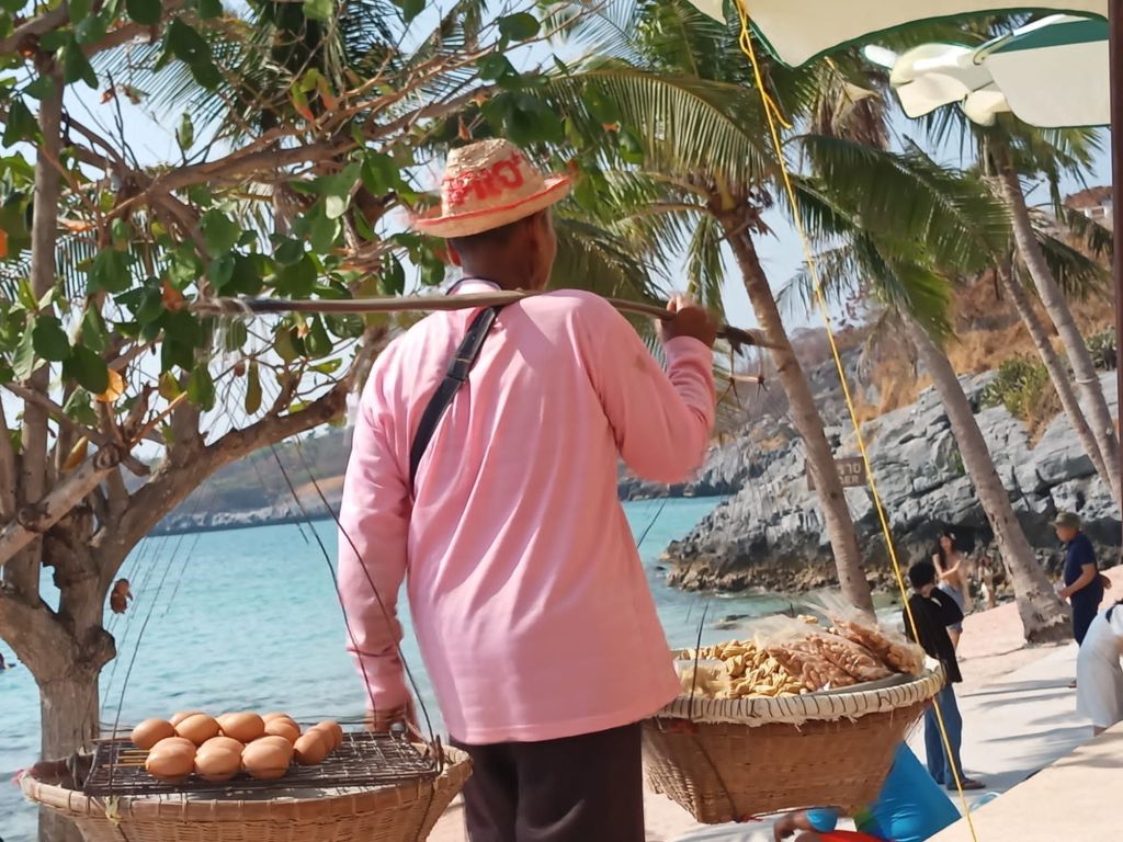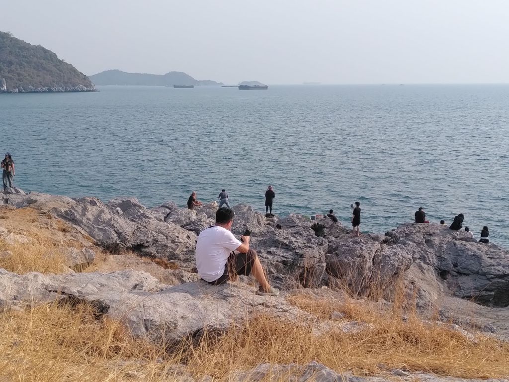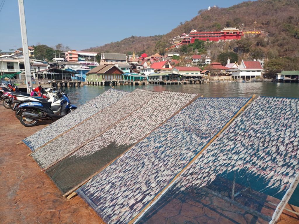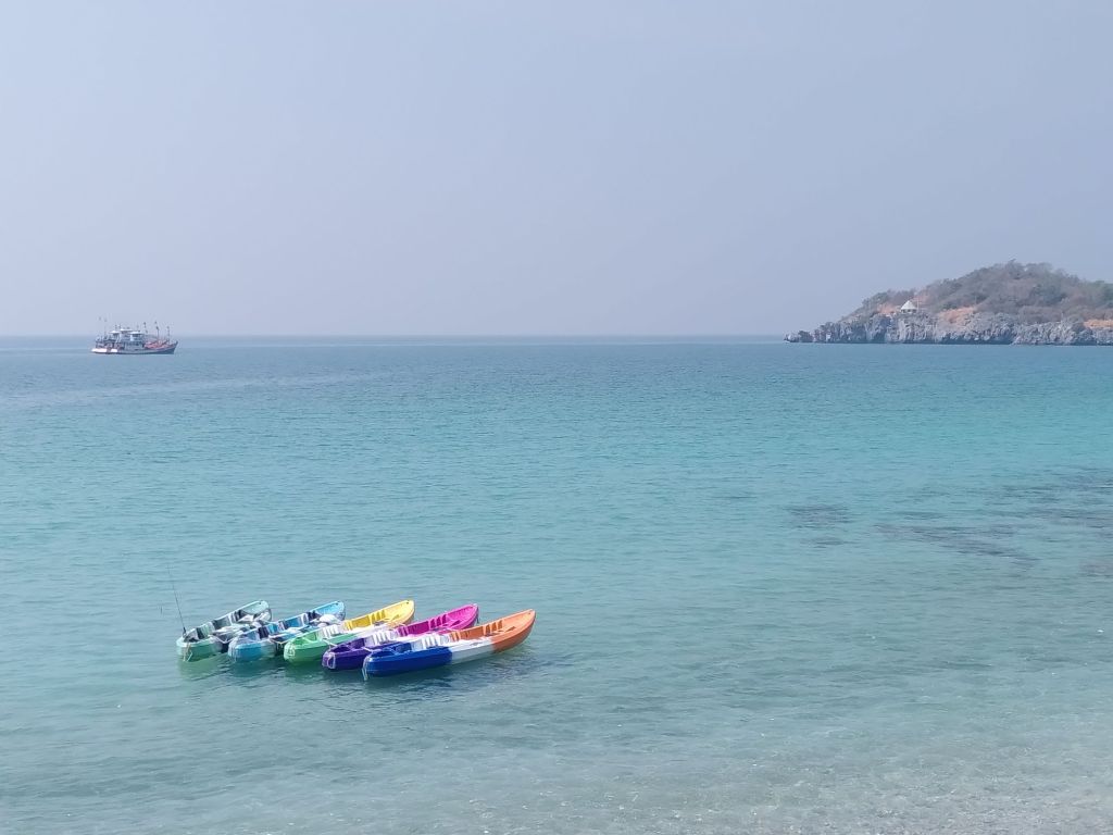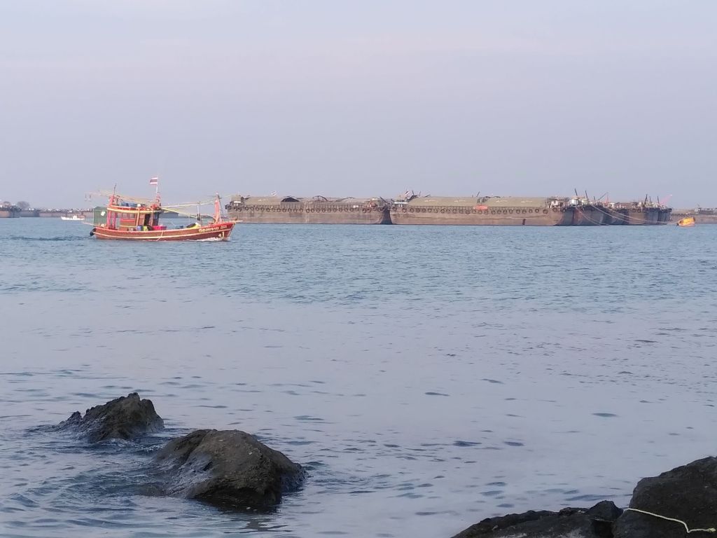 Die Chefin hier spricht recht gut Englisch und wir nützen die Gelegenheit, sie nach den ganzen Frachtern zu fragen, die vor der Insel ankern. Sie haben Zucker, Kohle und Reis an Bord, erzählt sie. Wenn wir es richtig verstanden haben, ist das hier so eine Art Wartehafen für diese Güter, die später nach Bangkok gebracht werden. Die Schiffe liegen wie ein Riegel im Meer vor der Insel.