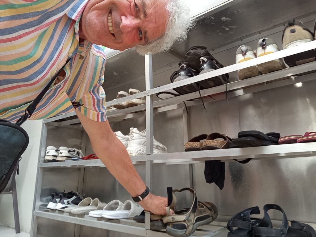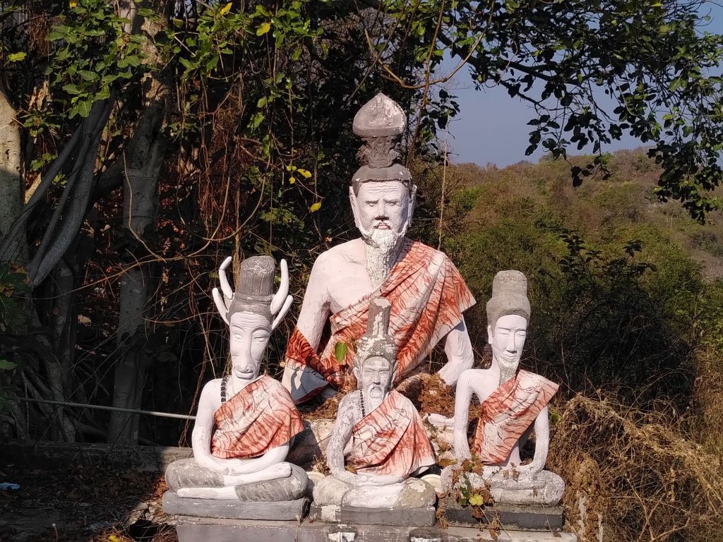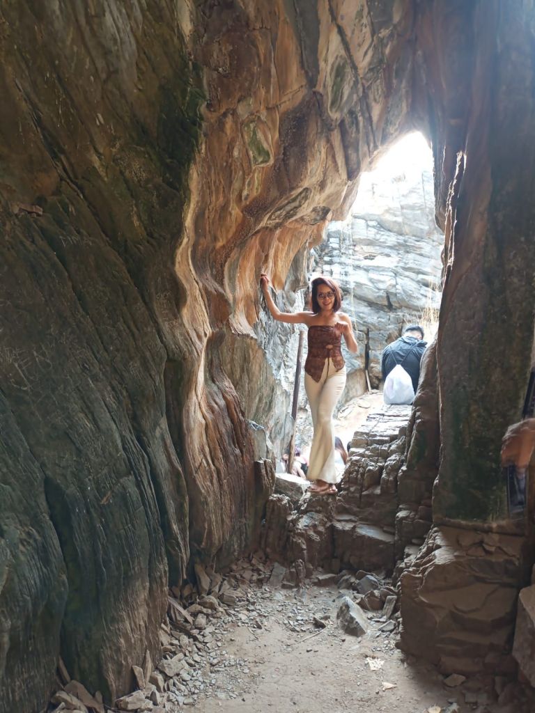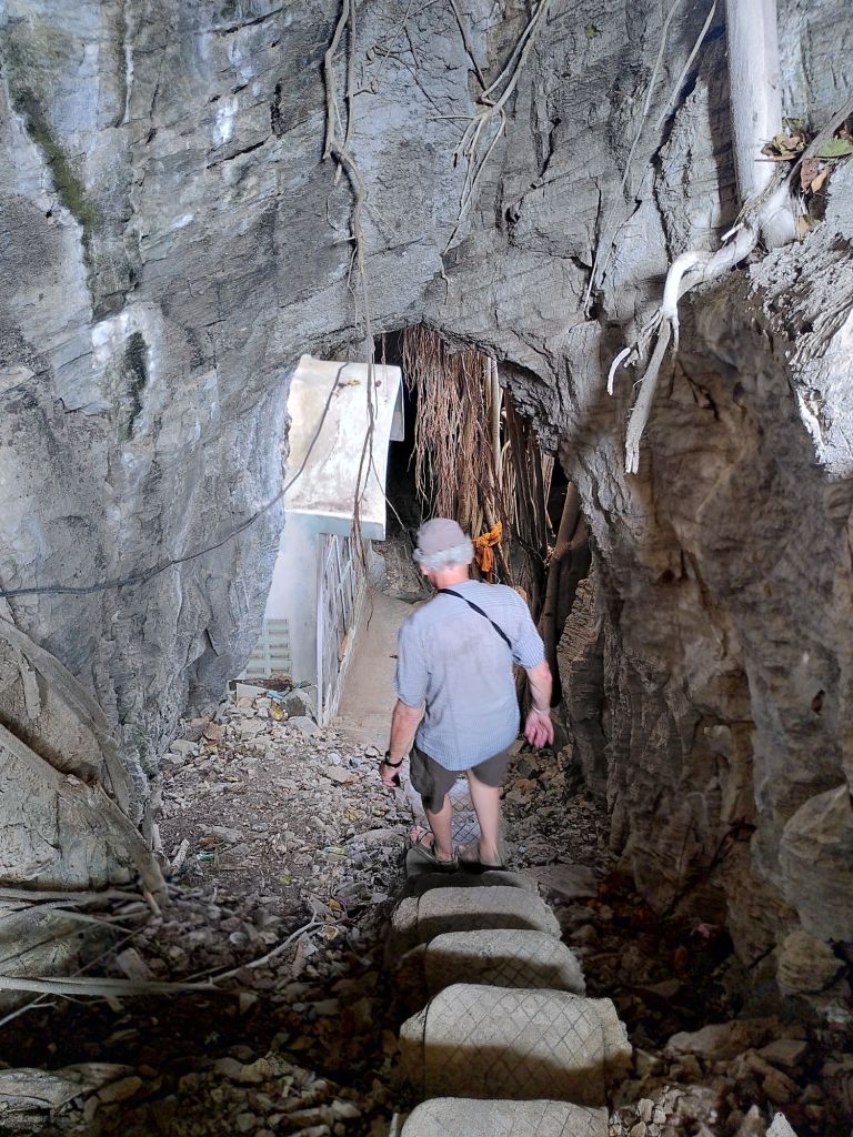 Ein Mönch lebt hier oben und zeigt uns gleich mal die Spendenbox. Nachdem wir unseren Obolus abgedrückt haben, gibt es Räucherstäbchen, Kerzen, eine äußerst feuchte Segnung und ein heiliges weißes Bändchen. Außerdem zeigt er uns den sehr steilen Weg hinunter in eine Höhle. Achim traut sich.