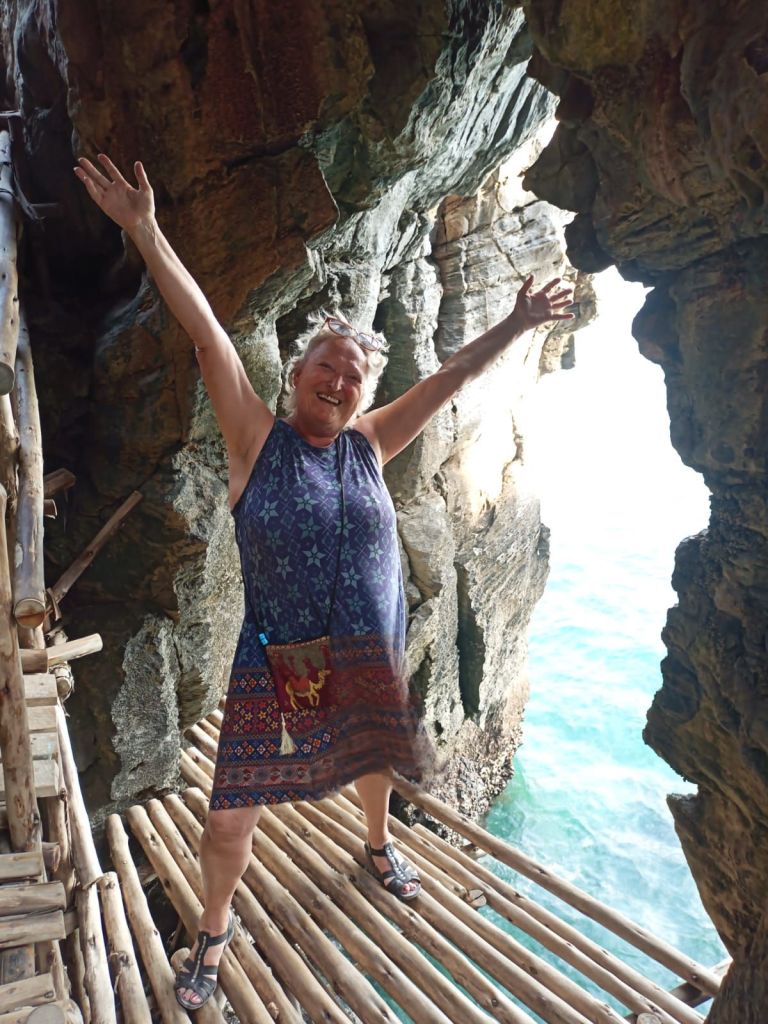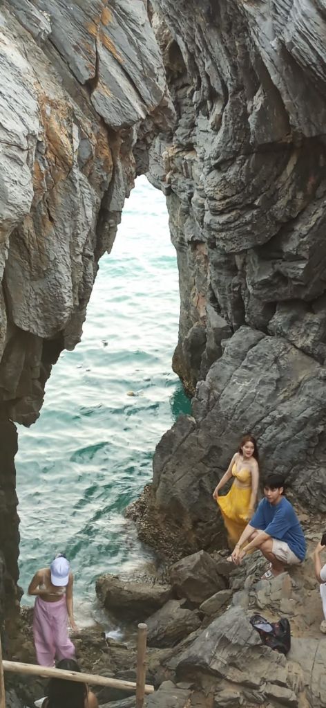 Kaum habe ich Instagram (aus politischen Gründen – auch Zuckerberg sponsort Mr. T.) verlassen, kommen wir am Nachmittag per Zufall zu DEM Instaspot der Insel. Vor den Felsabbbrüchen und in der Höhle posen die Youngsters was das Zeug hält. Vorher stylen sich die Mädels, ziehen sich extra um bzw. aus. Bauchfrei und winziges Top sind angesagt.