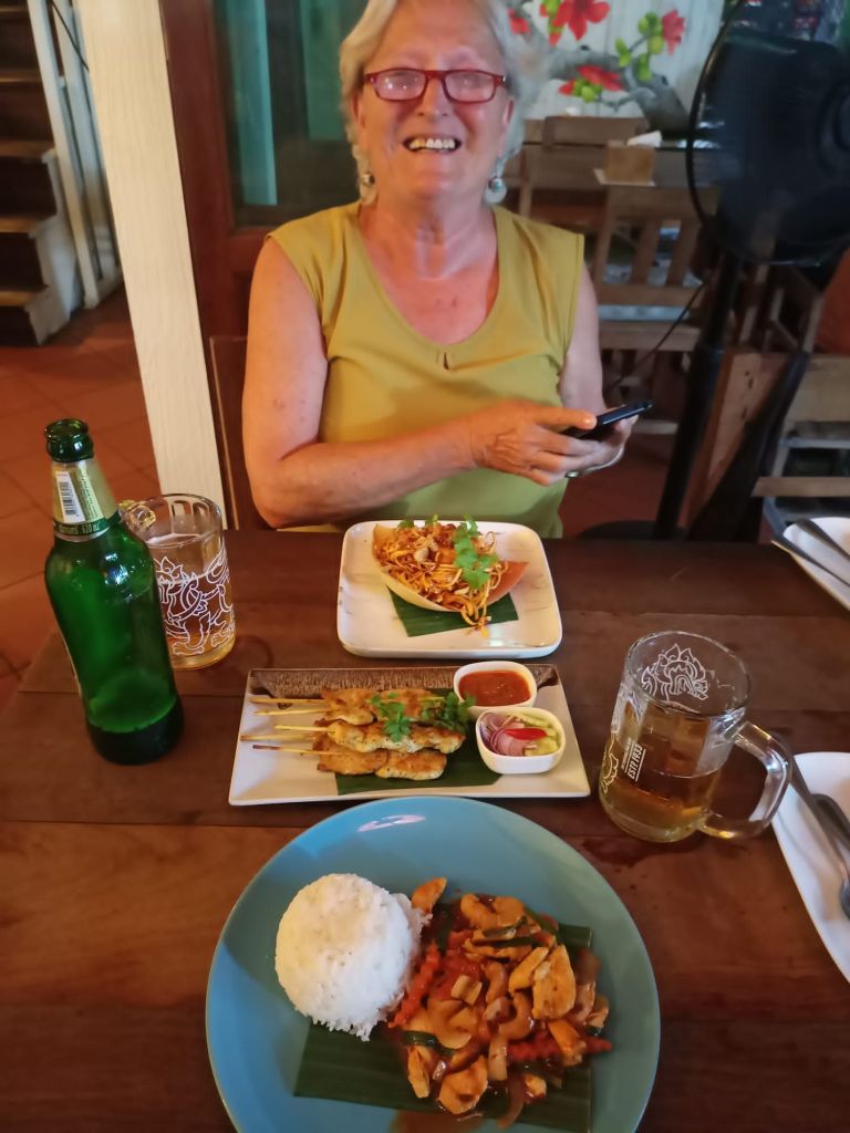 Da gibt es für uns ein kühles Getränk mit tierischer Begleitung, eine Dusche und ein köstliches Abschiedsessen mit Satay-Spießen, Morning Glory (Wasserspinat) und einem milden Curry.