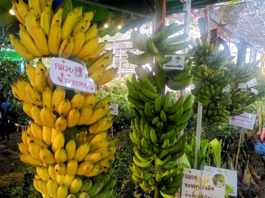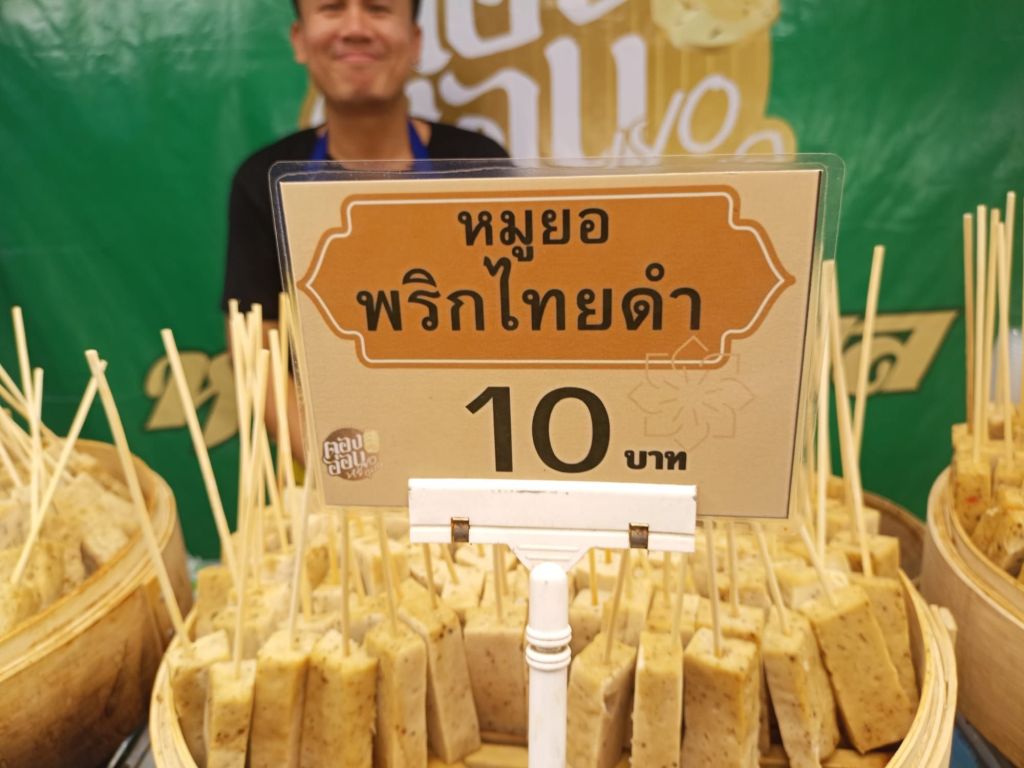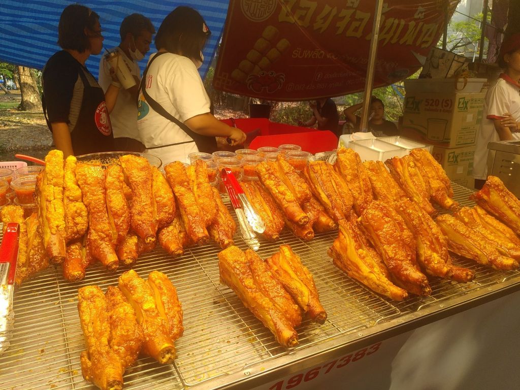 Nicht weit von hier ist die Kasetart-Universität. Hier findet diese Woche eine „grüne“ Messe statt. Die Uni hat die älteste landwirtschaftliche Fakultät des Landes. Was uns aber vor allem herlockt ist das riesige Food Festival, das im Rahmen der Ausstellung stattfindet. Und wir werden nicht enttäuscht. Ein Stand reiht sich an den anderen. Manches (er)kennen wir, vieles nicht. Wir probieren uns durch, essen Tamarinden, Tofu, Fleischbällchen, die ich für Kartoffeln hielt, Erdbeeren und trinken Chrysantemensaft. Den krossen Schweinenacken und den rohen Fisch lassen wir liegen.