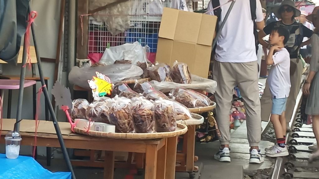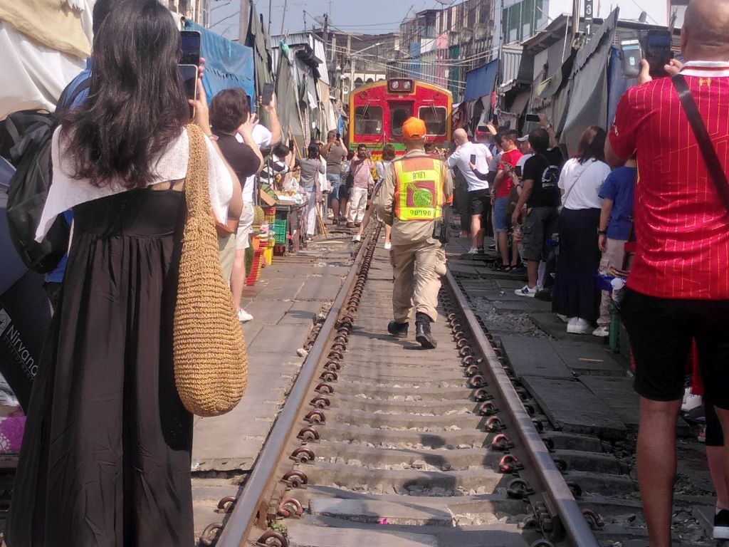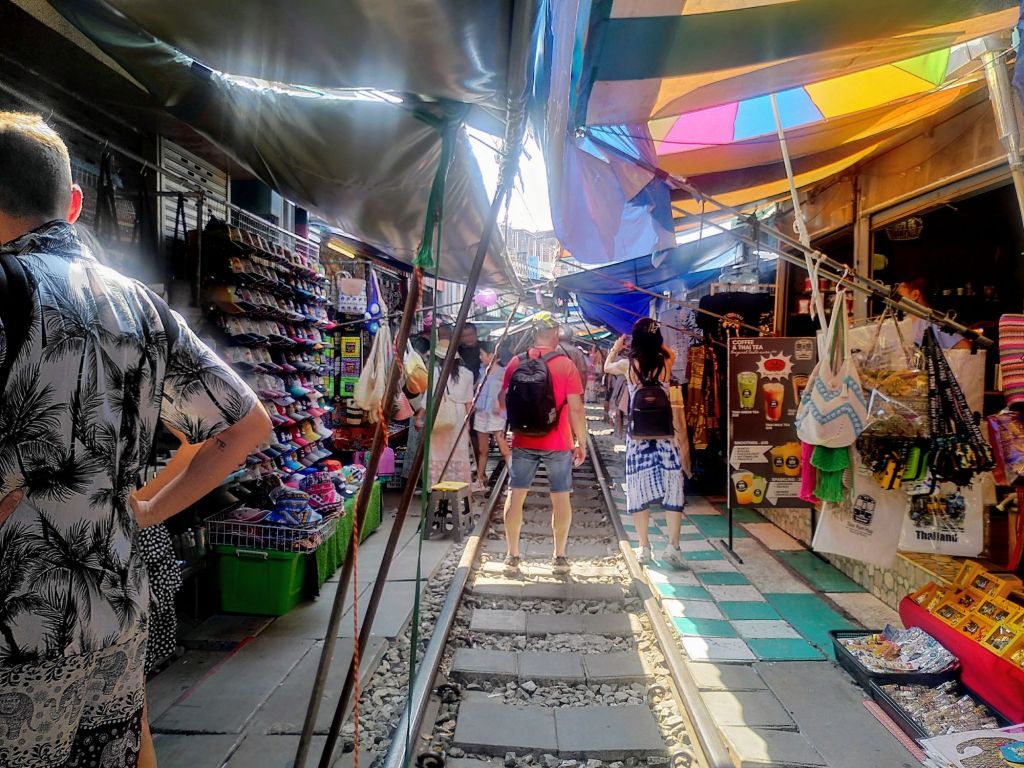 Kaum ist der Zug vorbei, werden die Markisen wieder ausgefahren, die Waren ausladend präsentiert und die Touristen flanieren wieder auf den Gleisen.