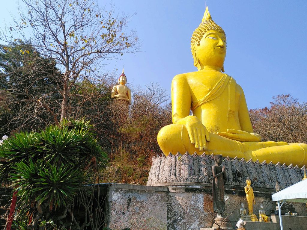 Der Goldene Buddha etwa ist zwar von unserer Unterkunft aus zu sehen, den Besuch haben wir uns aber für heute aufgehoben. Schon vor dem Frühstück statten wir ihm einen Besuch ab. Dazu müssen wir mal wieder kräftig hügelan fahren und dann viele Stufen hoch laufen.