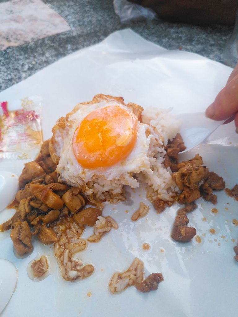 Wir sind ja schon im Museum etliches gelaufen und nun auch nochmal, jetzt sind wir erschöpft und die Füße tun mir weh. Wir lassen uns auf einen letzten Snack (Spiegelei auf Reis an Huhn) nieder und treten den Rückweg zum Pier an.