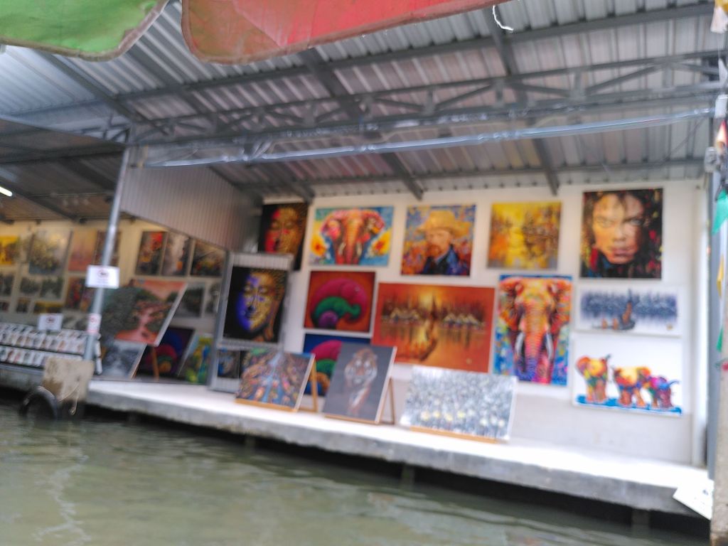 Auf den Booten, die rechts und links am Ufer vertäut sind und auf denen, die wie wir auf dem Wasser unterwegs sind, wird alles mögliche verkauft. Hoch im Kurs sind frisches Obst, Kokoseis, frittierte Bananen, Säfte und Souvenirs aller Art. Auch Kunst ist im Angebot.