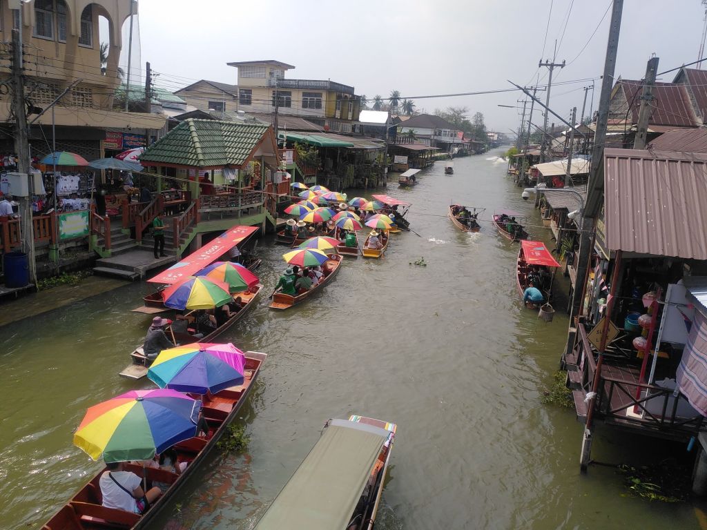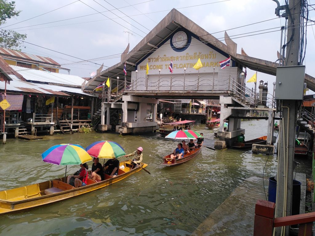 Nach etwa zwei Stunden erreichen wir   Damnoen Sudak. 1868 fand hier der erste floating market statt. Damals war es noch ein authentischer Markt für die Menschen vor Ort. Heute ist er nach wie vor sehr malerisch aber nur noch für Touristen gedacht. Früher gab es hier keine Straßen und die Fortbewegung und der Handel, vor allem mit Obst und Gemüse, fanden auf dem Wasser statt. Heute werden wir zu sechst in ein Ruderboot verfrachtet und durch die Kanäle geschippert.
