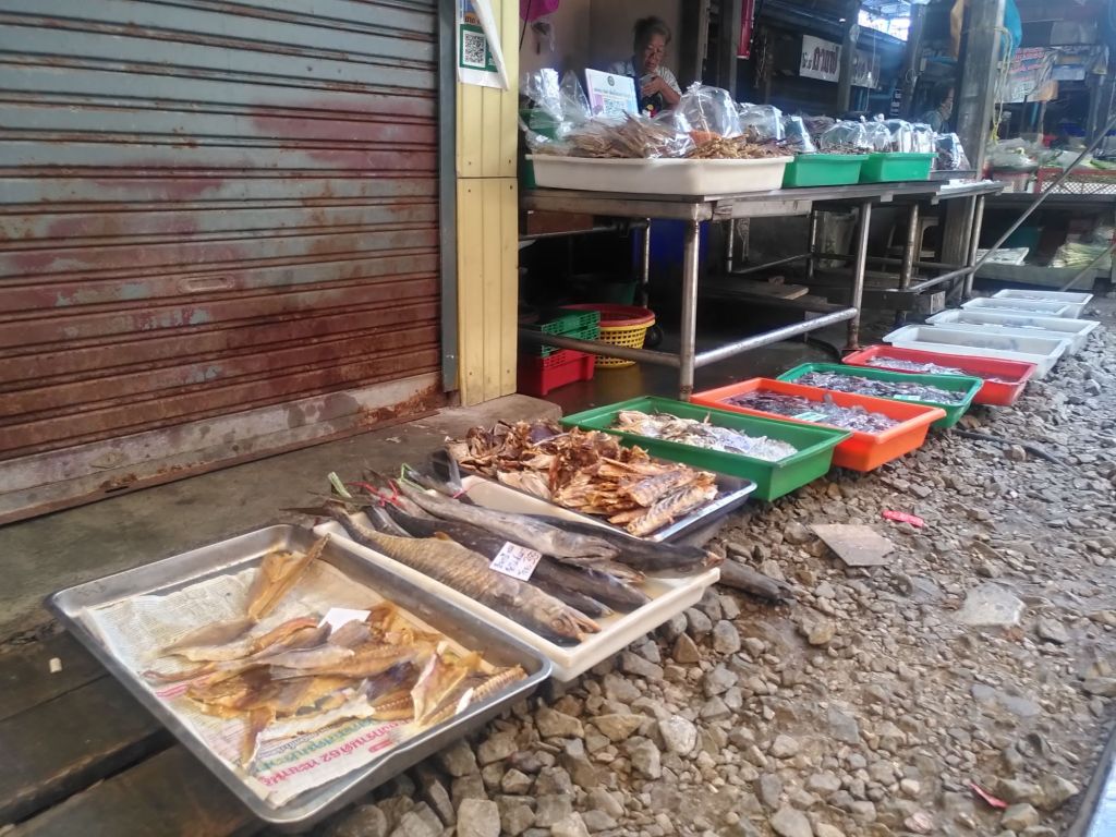 Rechts und links der Gleise bieten die Händlerinnen und Händler ihre Waren an, auf dem Boden, auf Tischchen, an richtigen Ständen. Sie schützen sich und ihre Waren mit Markisen vor der Sonne.