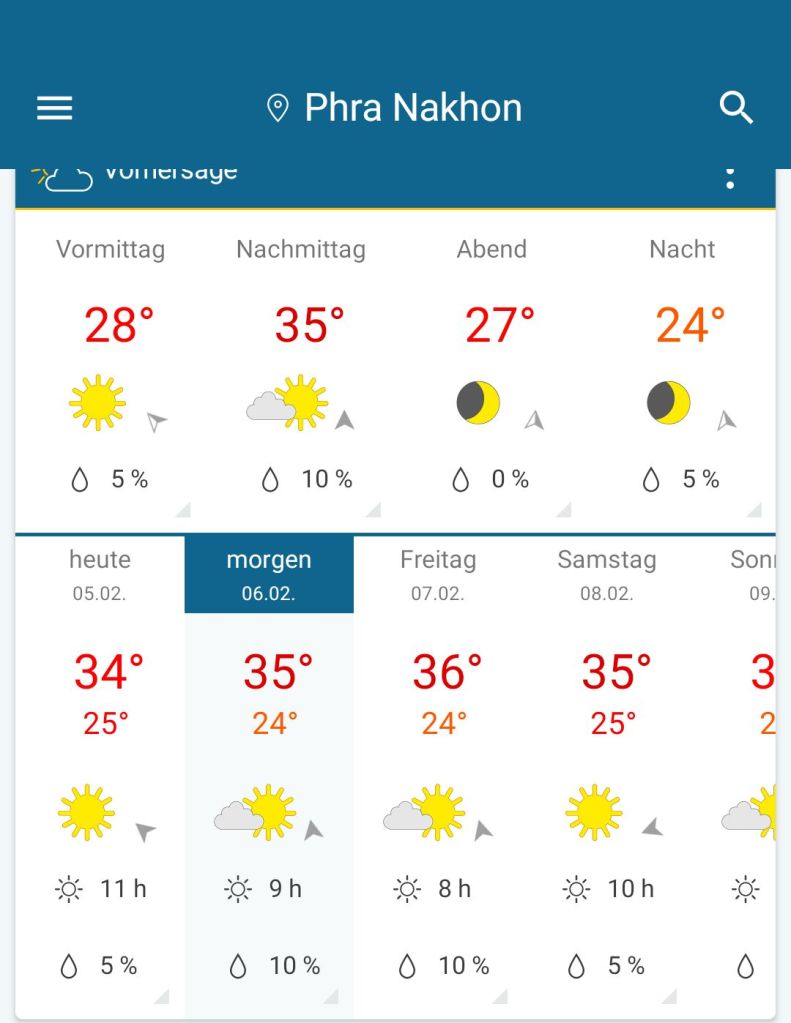Diesmal haben wir uns im U need-guesthouse eingemietet, ein Tipp, den wir unterwegs bekommen haben. Es liegt in einem lebhaften Viertel, das wir heute noch erkunden wollen. Wir haben auch sonst noch einiges vor hier in Bangkok und freuen uns auf die nächsten drei Tage. Bei 36 Grad gehen wir das Ganze aber mal sehr langsam an.