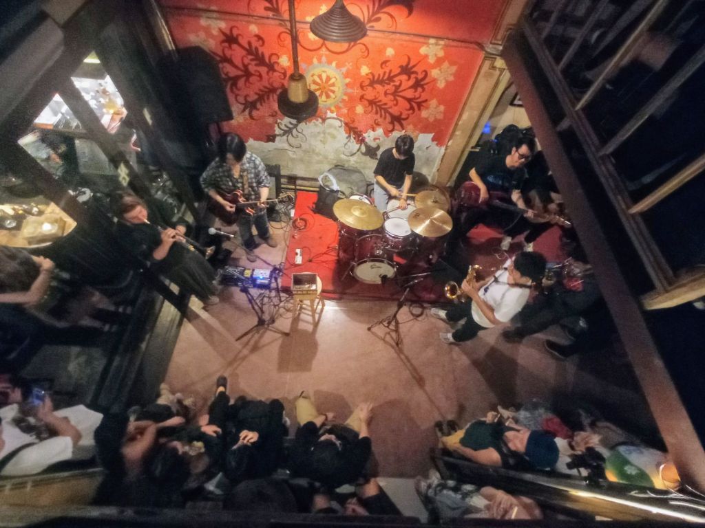 Im ersten Set spielen sieben junge Musiker ein schönes Repertoire zwischen traditional und Freejazz. Einer von ihnen sieht westlich aus, die anderen sind Einheimische.