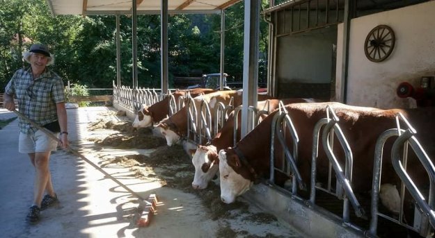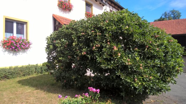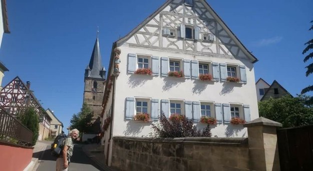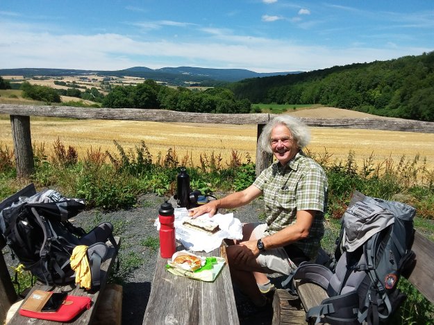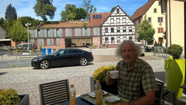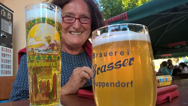 Ebenso gewaltig ist unser Frühstück im Hotel „Drei Linden“: Joghurt, Obst, Müsli, Kuchen, Käse und eine sehr schöne Wurstplatte mit dünn aufgeschnittenem hausgemachtem Hackbraten mit Ei gefüllt, Geräuchertem und luftgetrockneter Mettwurst. Für die Brotzeit dürfen wir uns für 1 Euro das Stück Brote schmieren.