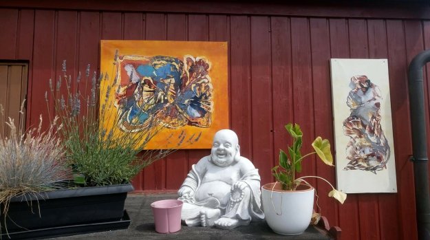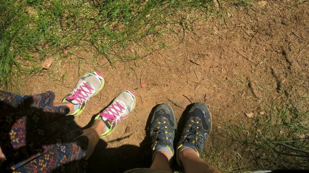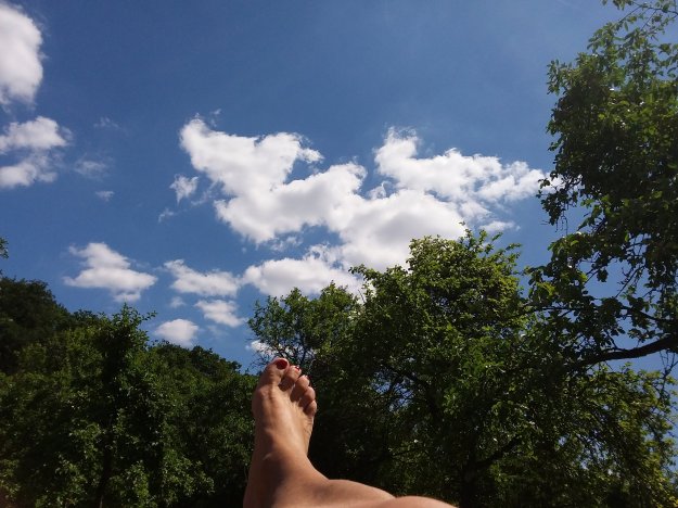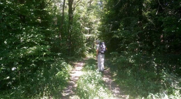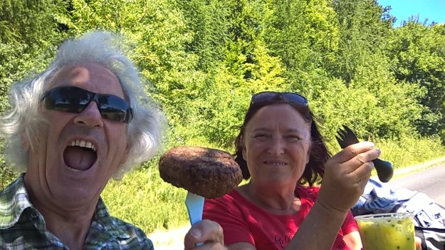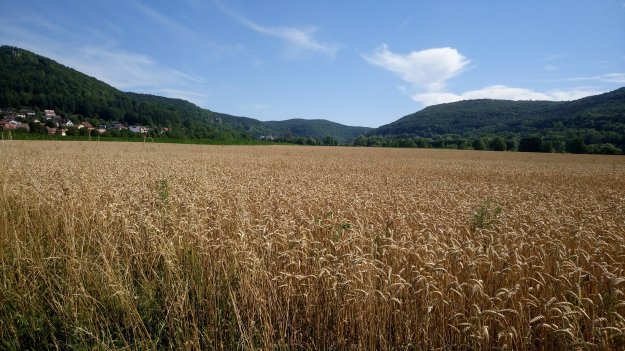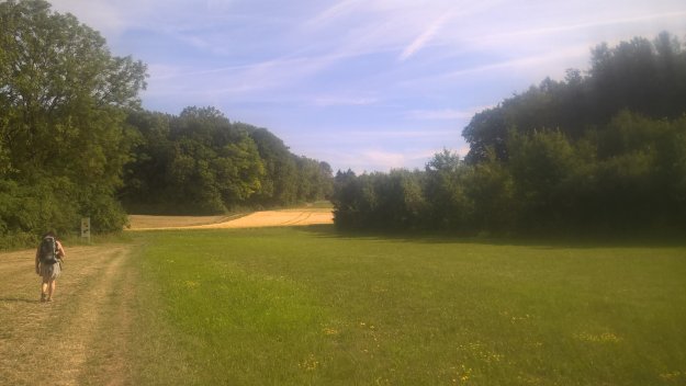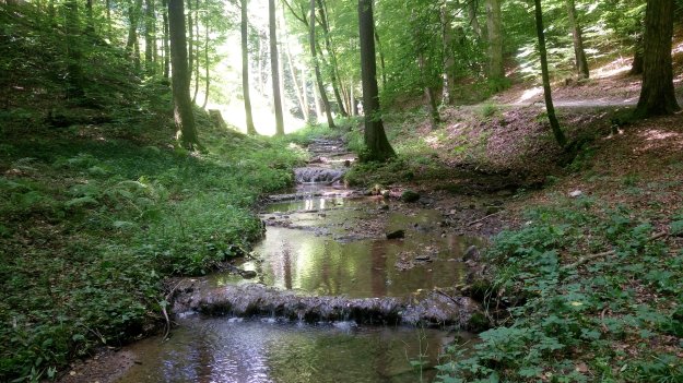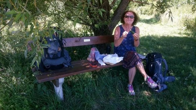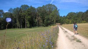 Während Achim einen Geocache sucht, raste ich. Das Bächlein vor mir gluckert, die Schmetterlinge flattern und im nahegelegenen Dorf kreischt die Kreissäge. Ich ziehe meine Laufschuhe aus und gönne meinen Zehen eine Brise Frischluft. Gut, dass mir die Füße (noch) nicht wehtun. Auch der Rücken meckert nicht, obwohl ich den Rucksack, vor allem, wenn’s bergauf geht, ziemlich schwer finde. Also alles noch fein.