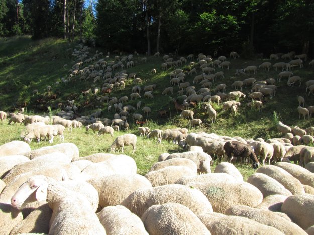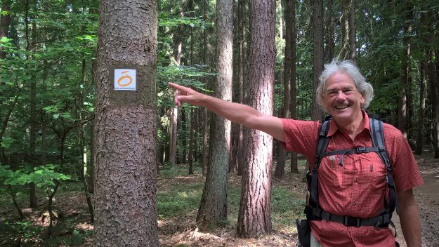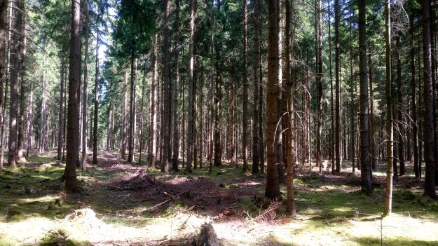 Nach einem Kilometer tauchen wir erleichtert in den Schatten des Waldes ein. Gestern und vorgestern liefen wir durch Laub- und Mischwälder, heute ist es Nadelwald, der auch intensiv von der Forstwirtschaft genutzt wird.