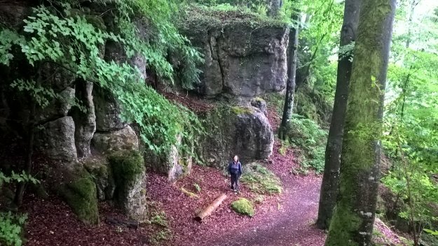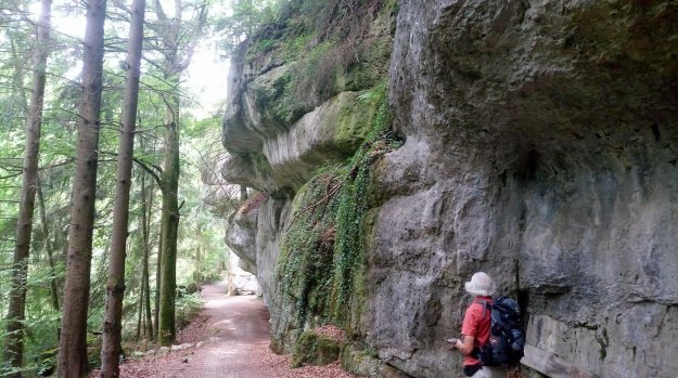 Wir laufen ein Stück weiter und dann ist sie da, die fränkische Schweiz mit ihren beeindruckenden Felswänden und -nadeln. Das Tal ist hier so schmal, dass unser Wanderweg unweit der Straße verläuft, aber wir werden durch großartige Anblicke entschädigt und finden zusätzliche Abwechslung durch das Beobachten der Kletterer, die hier an den steilen Wänden rumturnen.