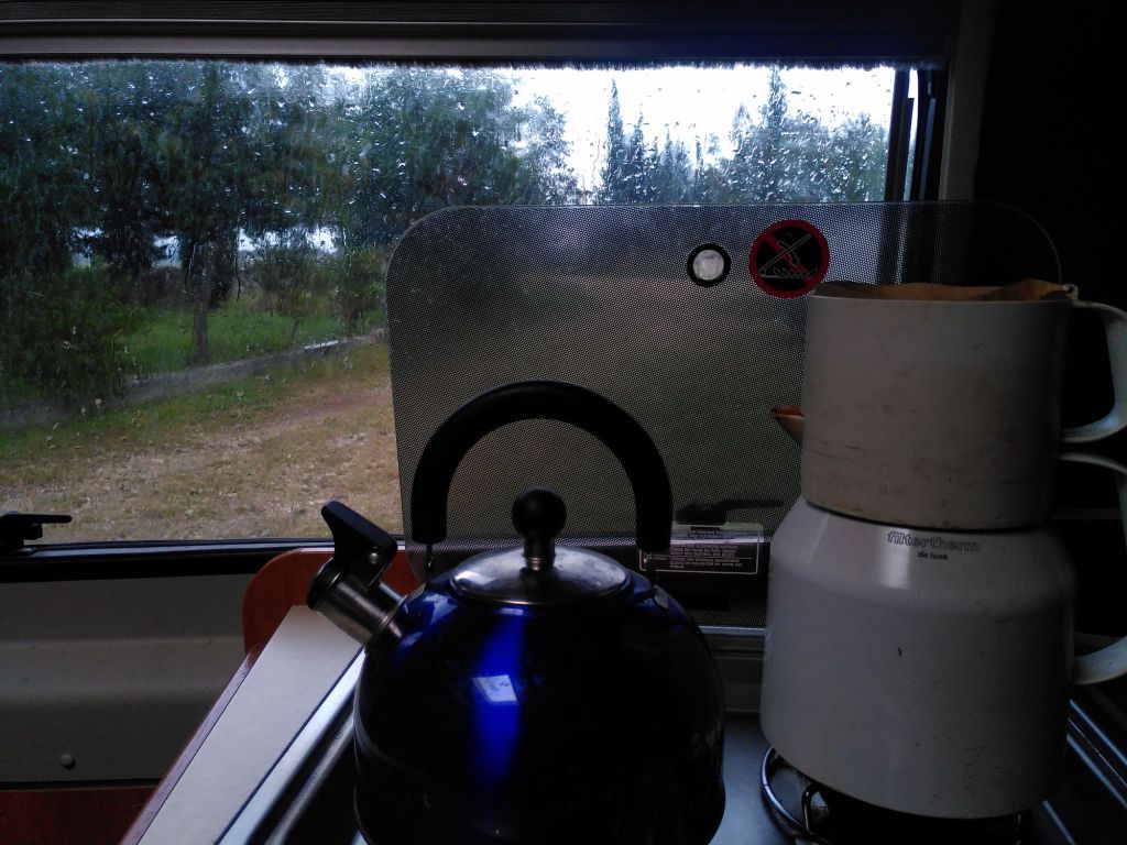 Wir sind gestern vor Starkregen gewarnt worden. Auf dem Platz der Parkverwaltung stehen wir gut und sicher. Deshalb warten wir nun mal ab, was kommt. Bisher nicht viel.