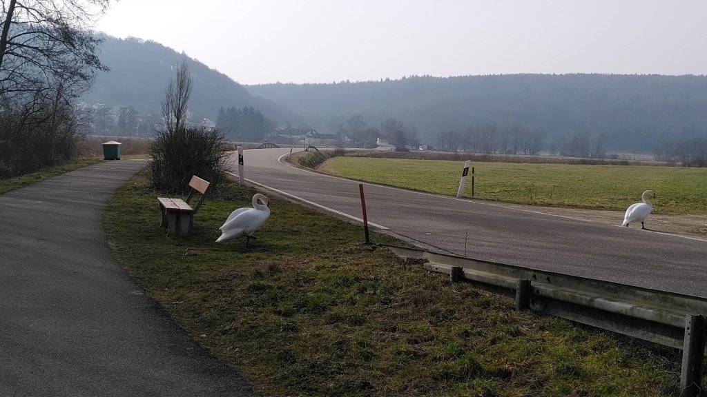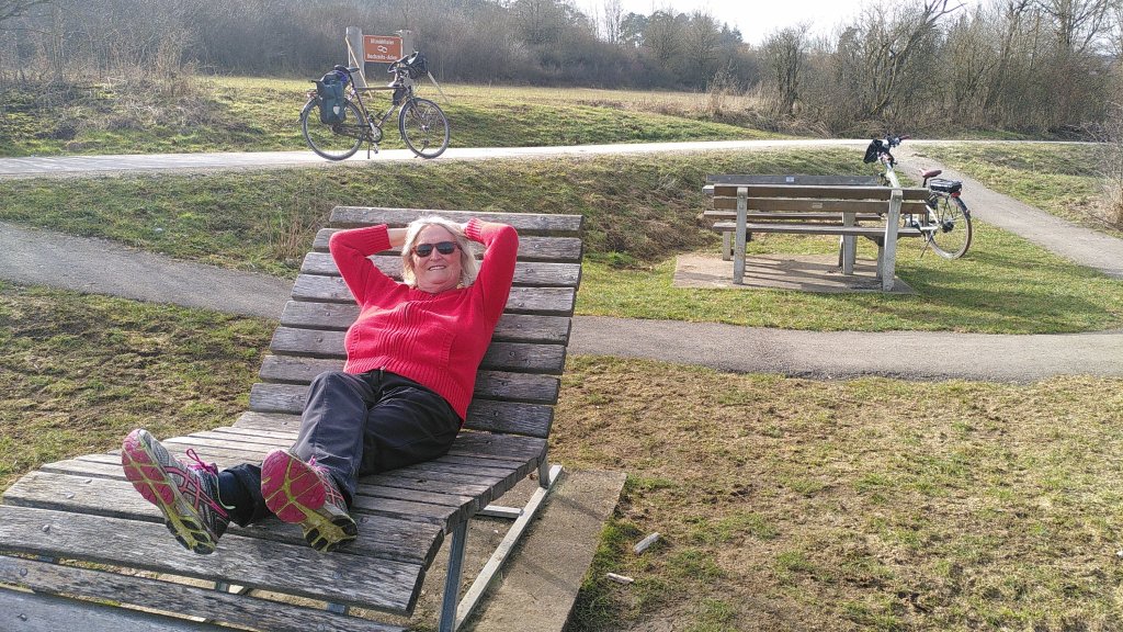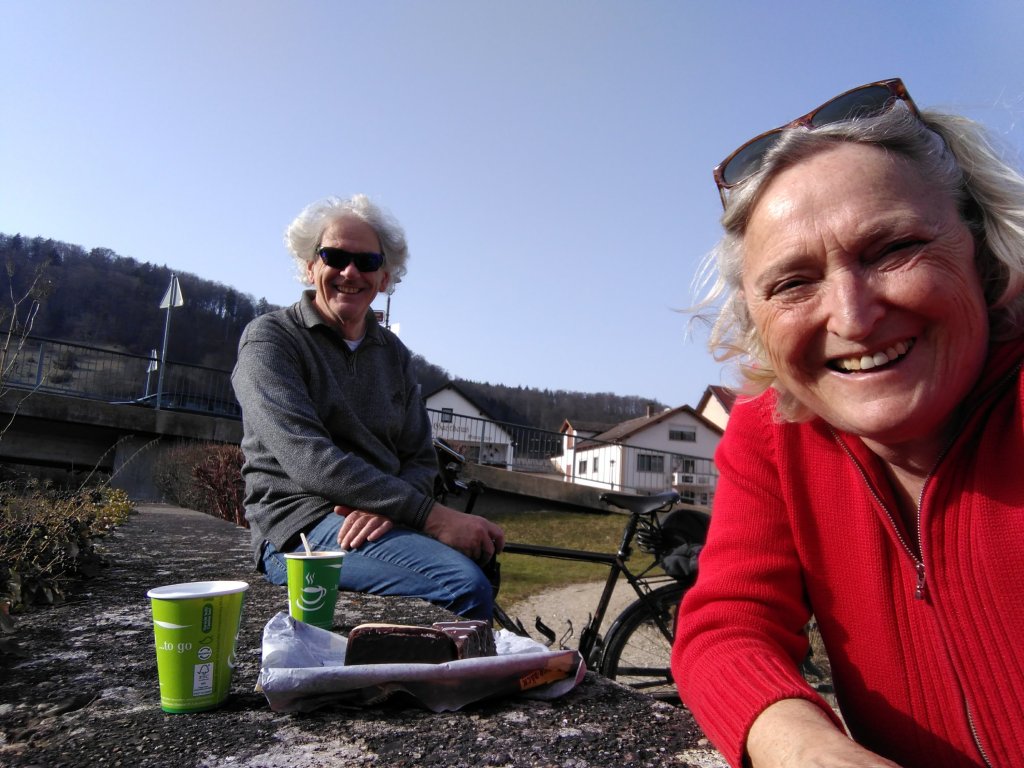 Wir gucken ihr ein bisschen beim Gucken zu und gehen zurück zu unseren Rädern. Die Auenlandschaft ähnelt der, die wir gestern gesehen haben. Das Radfahren bei den frühlingshaften Temperaturen ist reine Freude.