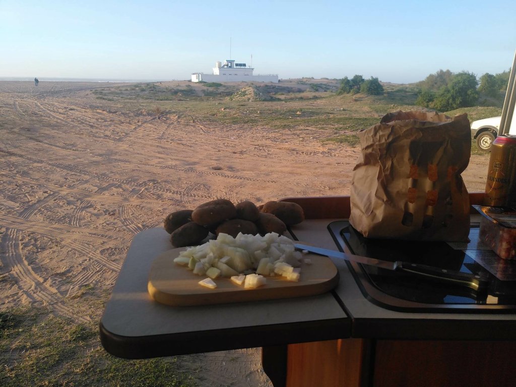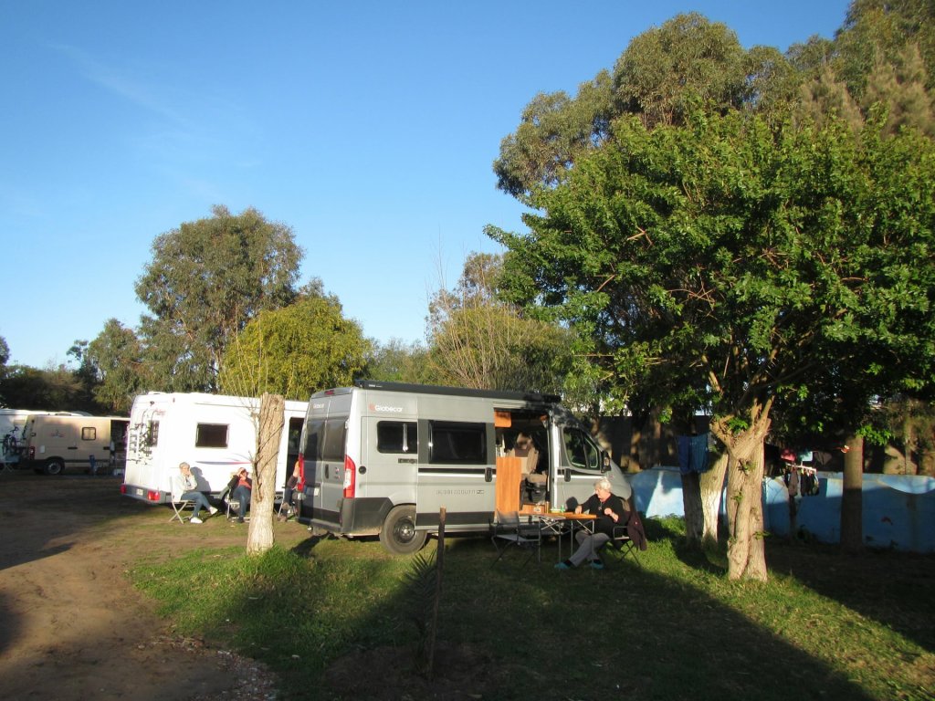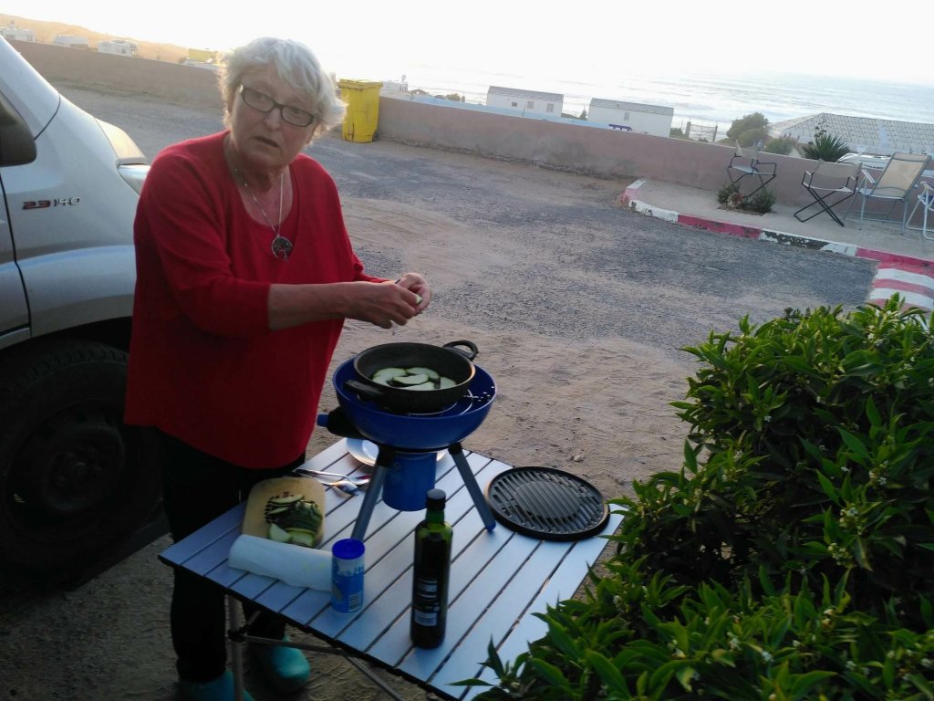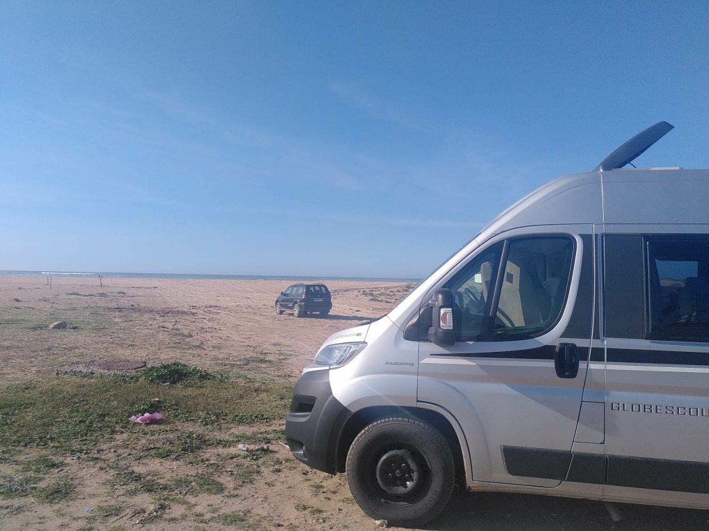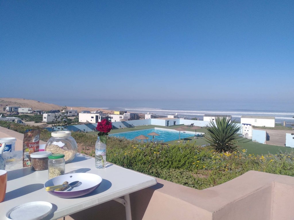 Es ist fast dunkel, als wir auf dem Campingplatz in Sidi Wassay, rund 60 Kilometer südlich von Agadir, ankommen. Der Platz ist terrassiert und wir stellen die Busse auf einer der oberen Ebenen ab. Am nächsten Morgen sind wir hin und weg von der Aussicht, die sich uns bietet. Blauer Himmel, blauer Atlantik, der mit weißer Gischt ans Ufer schlägt, blauer Pool, sandfarbene Dünen. Normalerweise bin ich kein Fan von Kunstrasen, aber hier bietet er rundum das Schwimmbecken den grünen Farbtupfer.