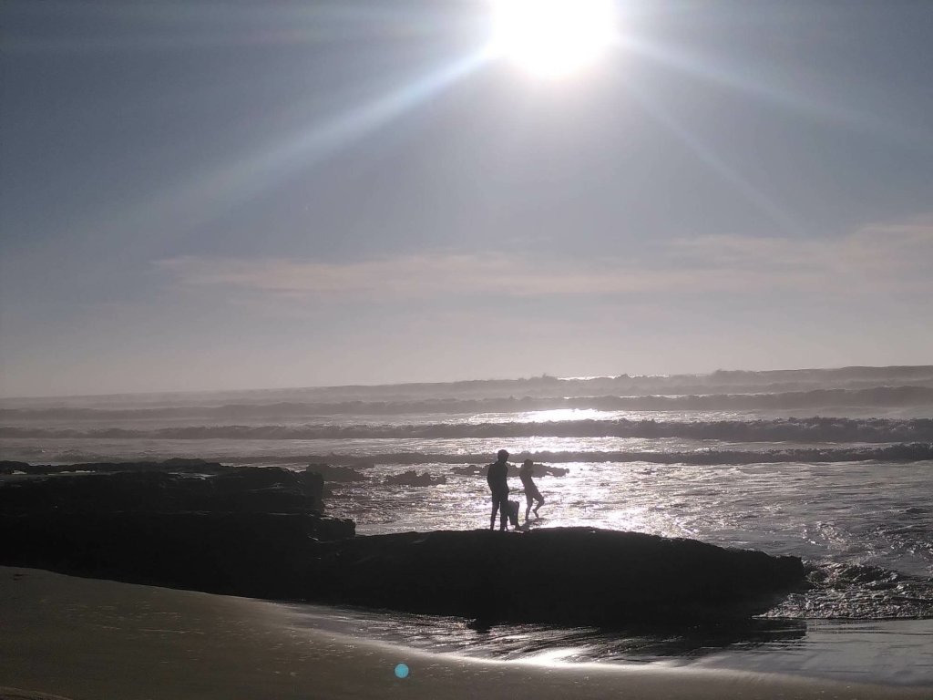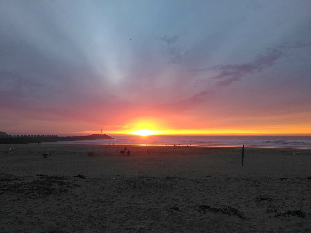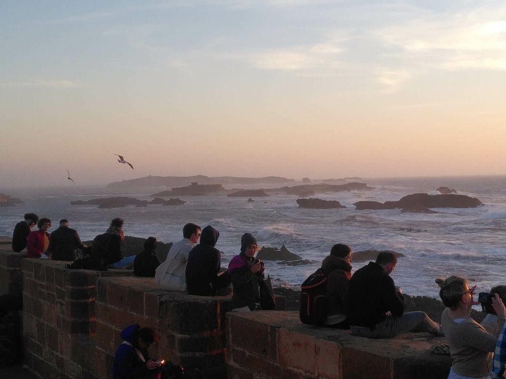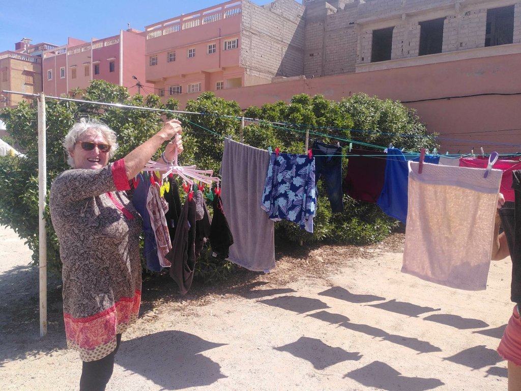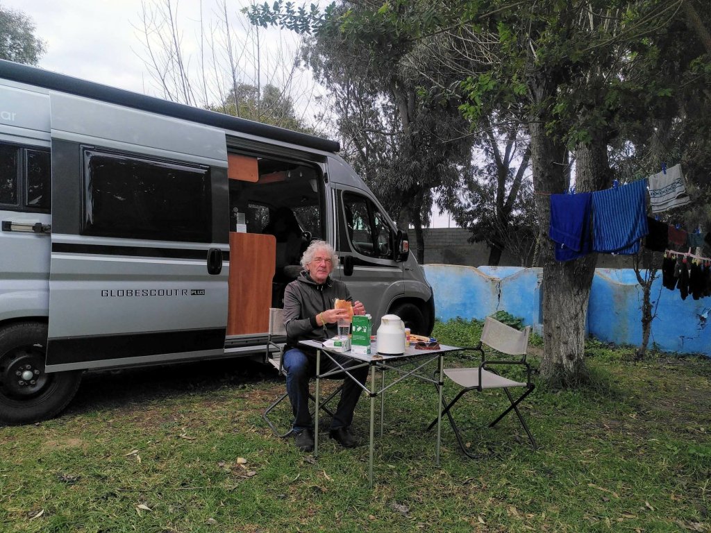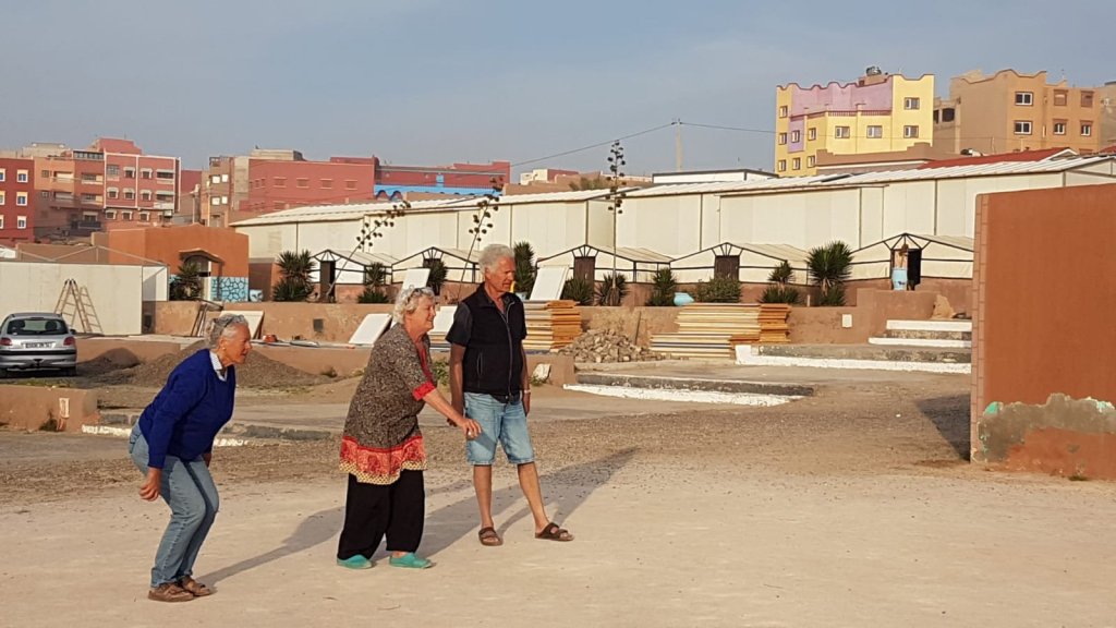 Es ist fast dunkel, als wir auf dem Campingplatz in Sidi Wassay, rund 60 Kilometer südlich von Agadir, ankommen. Der Platz ist terrassiert und wir stellen die Busse auf einer der oberen Ebenen ab. Am nächsten Morgen sind wir hin und weg von der Aussicht, die sich uns bietet. Blauer Himmel, blauer Atlantik, der mit weißer Gischt ans Ufer schlägt, blauer Pool, sandfarbene Dünen. Normalerweise bin ich kein Fan von Kunstrasen, aber hier bietet er rundum das Schwimmbecken den grünen Farbtupfer.