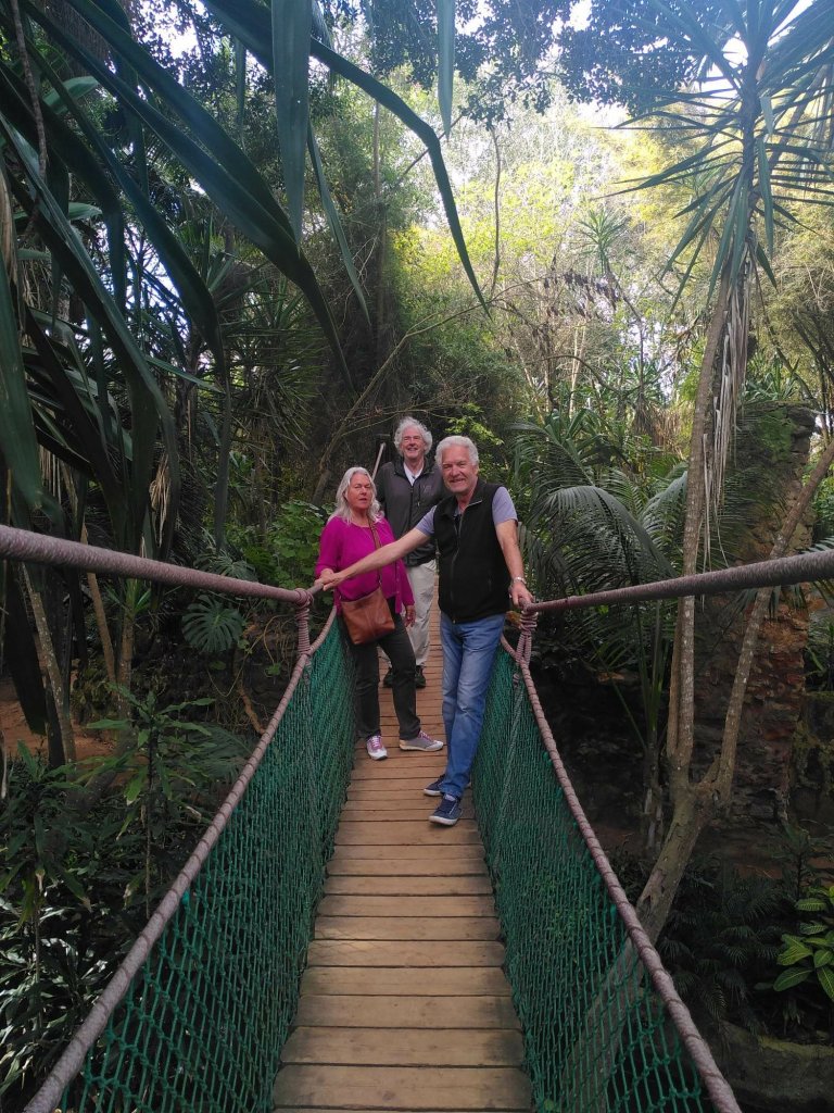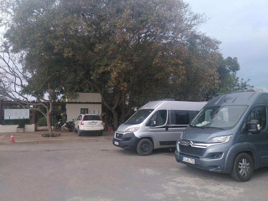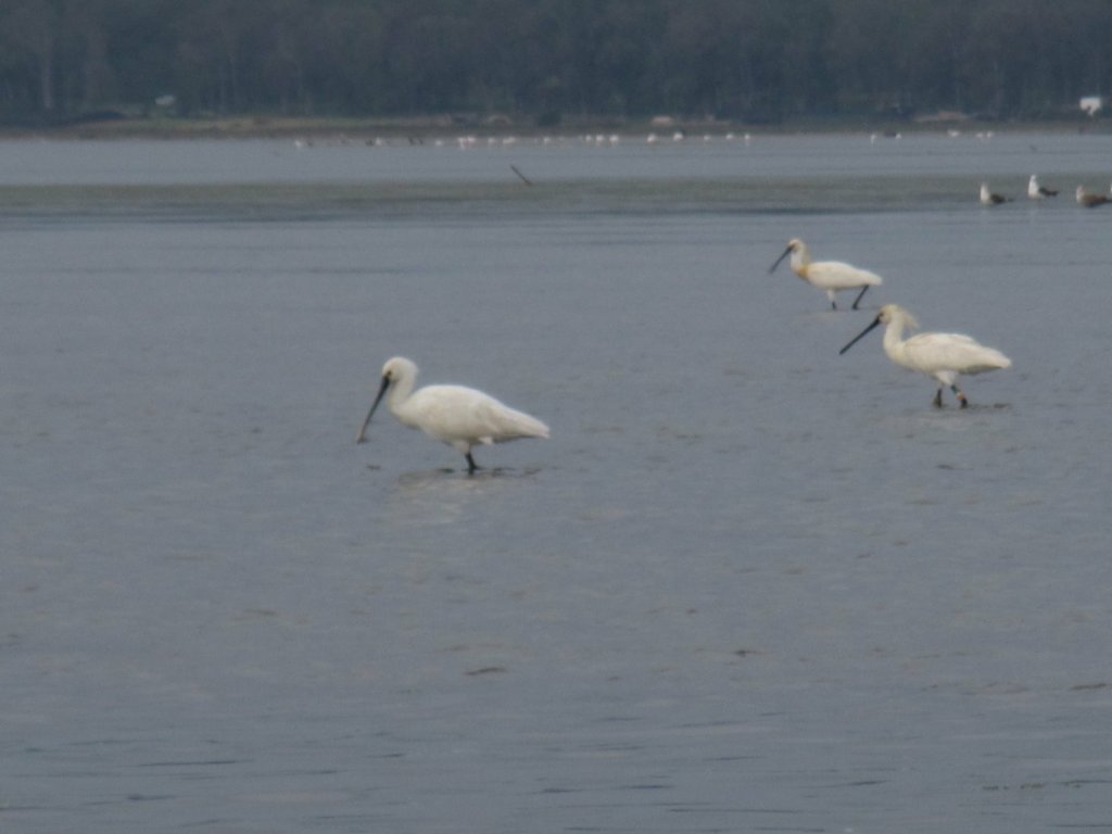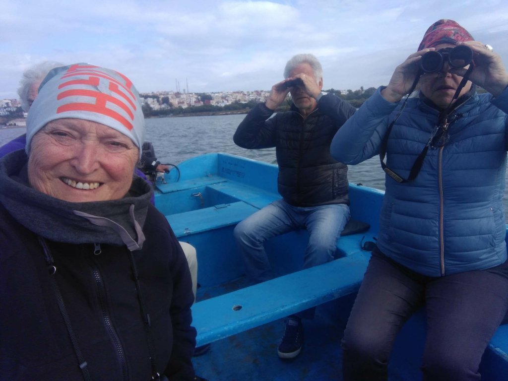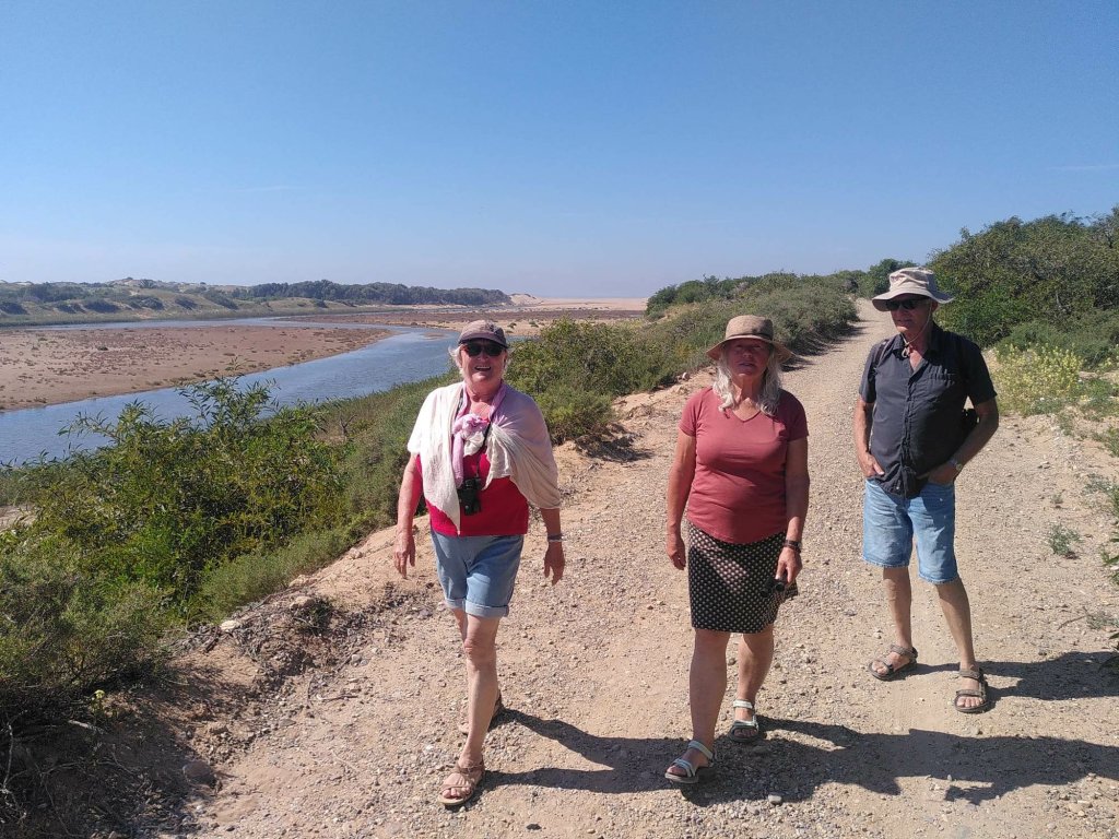 Es gibt überdachte Beobachtungsstände, daneben Infotafeln über Flora und Fauna. Wir lernen, dass hier außerdem eine sehr seltene kahlköpfige Ibis-Art lebt. Natürlich wollen wir einen Blick auf diese besonderen Tiere erhaschen. Und tatsächlich: nach längerer Suche und einigem Fehlalarm entdecken wir zwei große Gruppen auf einer Sandbank. Sie stehen zu weit weg, um sie mit unseren Kameras zu fotografieren. Achim ist so begeistert, dass er am nächsten Tag gleich nochmal mit seinem Spektiv wiederkommt.