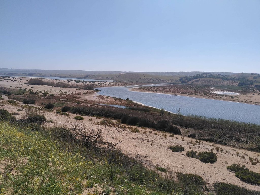 Nach einer guten Stunde erreichen wir den Fluss Oued Massa, der hier ins Meer mündet. Wir können ihn trockenen Fußes queren, weil er, wie wir später von einem Wächter erfahren, auf den letzten Metern unterirdisch verläuft. Auf der gegenüberliegenden Seite des Flusses finden wir das nördliche Eingangstor in den Nationalpark. Auf den Sandinseln im Flussdelta lassen sich Löffler (vor wenigen Tagen wusste ich noch nicht mal, dass es diese Vögel gibt. Jetzt erkenne ich sie sogar. Ich sag ja immer: Reisen bildet), Graureiher, Flamingos und auch ein Seeadler durchs Fernglas bewundern.