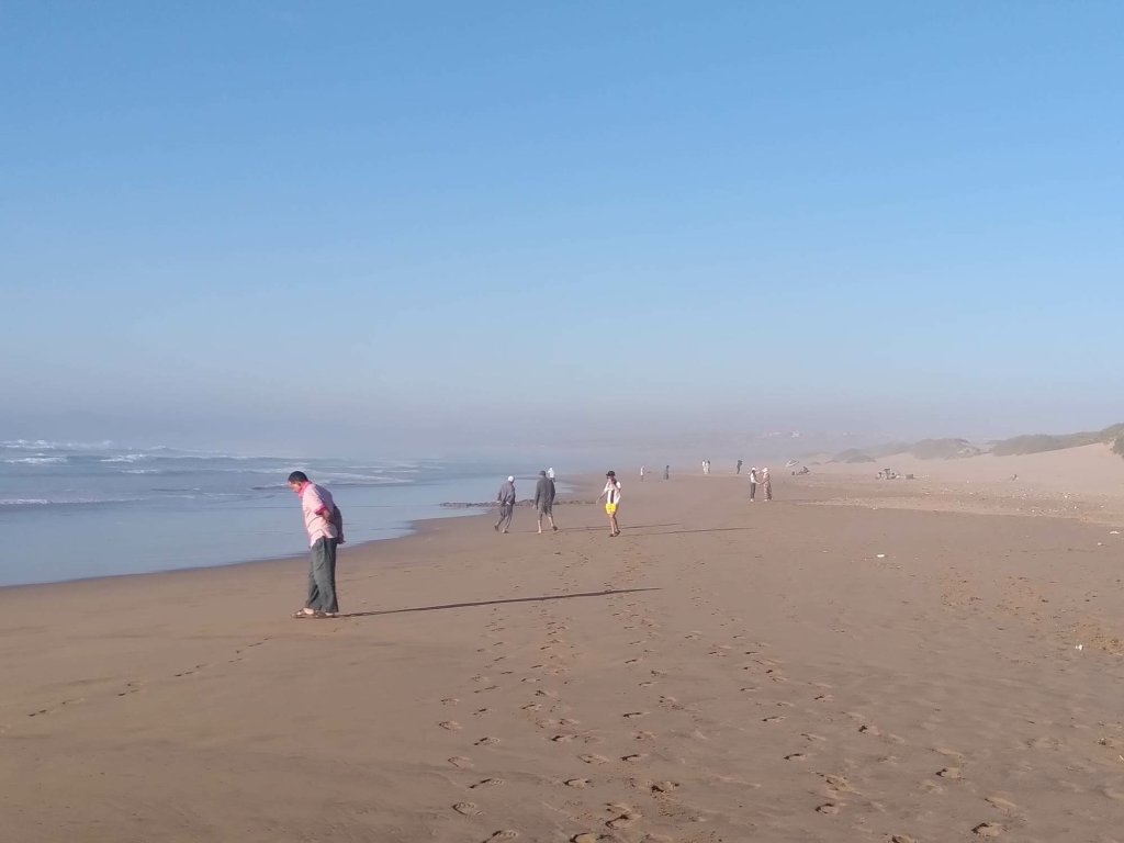 Dann packen wir die Rucksäcke und machen uns auf zu der in unserem Reiseführer empfohlenen Zehn Kilometer-Wanderung in den Nationalpark Souss-Massa. Sie geht direkt am Campingplatz los, einfach drei Kilometer rechts rum am Strand entlang. Wir ziehen die Schuhe aus und planschen im Wasser herum. Am Strand ist einiges los. Kinder und junge Männer spielen im Sand, Familien haben sich Windmuscheln aufgebaut und kochen Tee, bei manchen sehe ich Tajines vorm Zelt stehen. Wir sind wiederum die einzigen Touristen hier. Der März scheint eine gute Reisezeit zu sein.