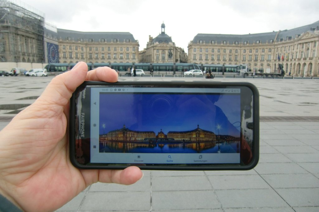 Berühmt ist auch die Place de la Bourse, von der man mithilfe des miroir d’eau (Wasserspiegel) wunderbare Aufnahmen machen kann. Aber ach, im Winter gibt es hier kein Wasser auf dem dafür vorgesehenen Terrain. Die tollen Fotos können wir nicht machen, aber ein Behelf fällt uns dann doch noch ein.