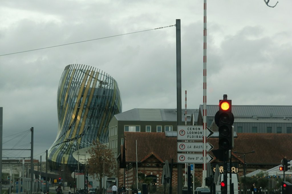 Was wir erst am Nachmittag lesen, nachdem wir die Stadt schon verlassen haben: „Die Architektur von Anouk Legendre und Nicolas Desmazières (XTU), die an die Bewegung des Weines in einem Glas erinnert, ist gewagt, der Standort in dem im Wandel begriffenen Stadtteil Bassins à Flot bedeutungsvoll. Wie Bilbao mit seinem Guggenheim und Sydney mit seiner Oper besitzt auch Bordeaux ein modernes, auf sein Vorzeigeprodukt Wein verweisendes Wahrzeichen.“ Mist. Wir hätten es uns zumindest von außen ansehen sollen. Nächstes Mal! Immerhin erhaschen wir auf der Fahrt zu Darwin einen kurzen Blick aufs Ensemble.
